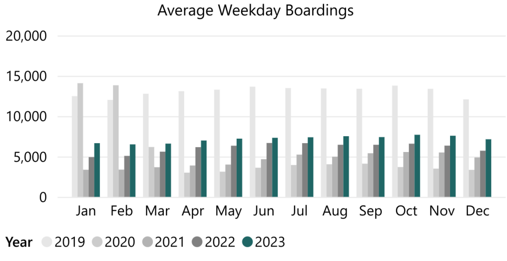 Yet the Route 40, with well over 7,000 boardings on the average weekday in 2023, remains one of King County Metro’s most frequently used buses and continues to gain ridership. Compared to December of 2022, this past December saw a ridership increase of nearly 25% on weekdays, or over 1,400 additional daily riders. Riders are returning to buses like the 40, even as one out of every four trips continues to run late. The focus on pre-pandemic ridership is a fairly transparent ploy to paint the route as unsuccessful and not worthy of investment, and at the same time ignores the potential gains to ridership that will come from increased speed and reliability. Pre-pandemic Route 40 ridership peaked above 13,000 daily boardings in 2019, which made it Metro’s third highest-ridership bus route.