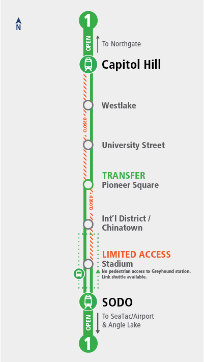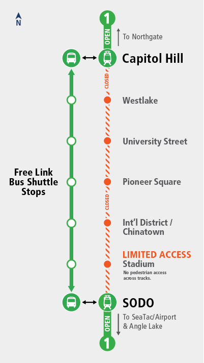 From August 12 through August 13, Link service will be suspended between Capitol Hill and SoDo. As a result, trains will run Capitol Hill-Northgate and SoDo-Angle Lake at 15-minute frequencies. A free shuttle bus will connect riders between Capitol Hill and SoDo with stops near the closed downtown tunnel stations. Shuttle bus service will be every 10 minutes.