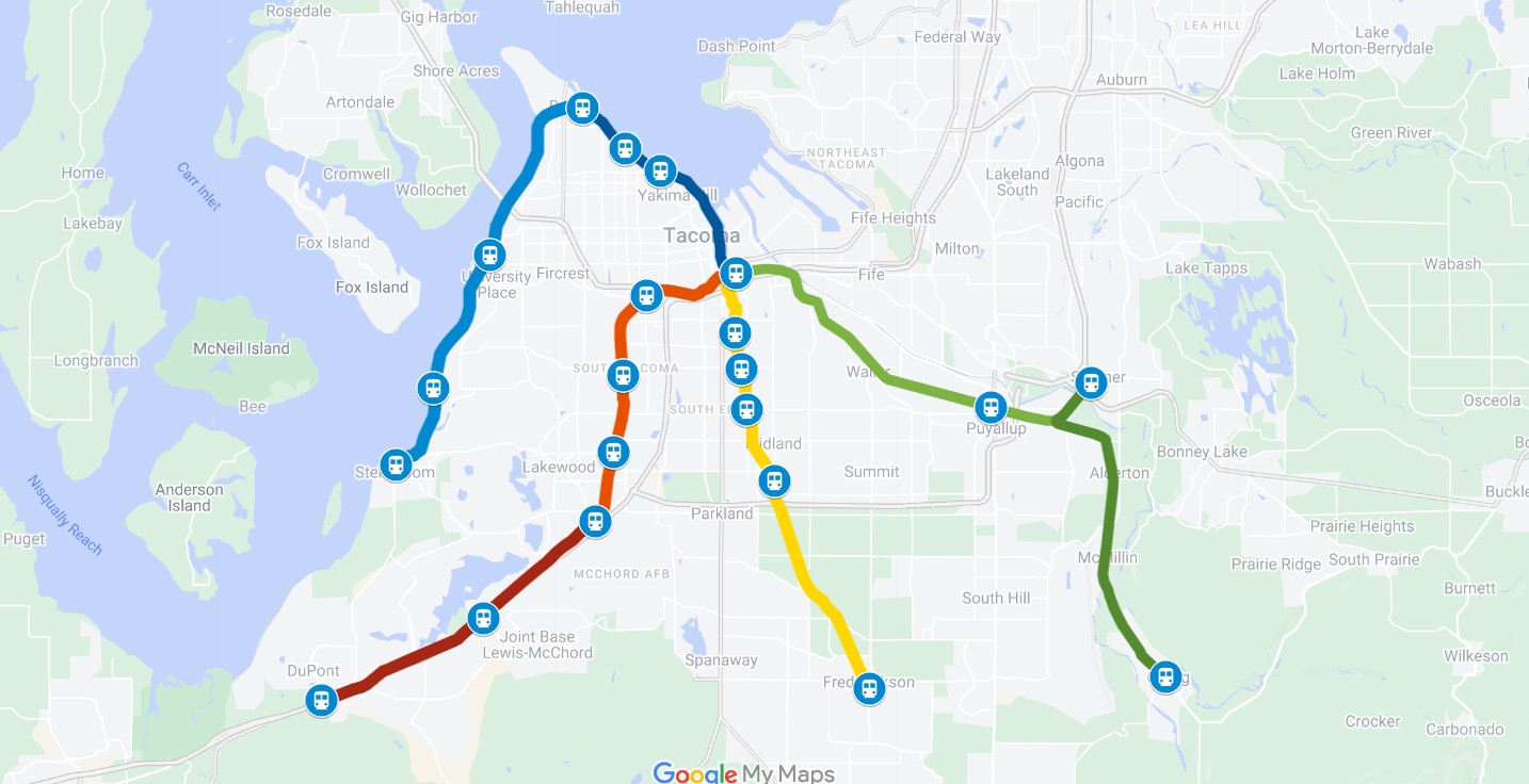 It’s no secret our region is lacking in heavy rail transit options. Our only existing service, Sounder, is operated in such a manner that it functionally excludes anyone who isn’t traveling into Downtown Seattle to work from 9 to 5. This is woefully inadequate to serve the South Sound, especially considering the significant employment centers of Downtown and the Port of Tacoma. Given Tacoma’s abundance of existing rail infrastructure there are a variety of potential passenger routes that could be developed quickly and cheaply relative to new light rail or even Pierce Transit’s proposed bus rapid transit (BRT) system while simultaneously feeding into and expanding the potential ridership for such planned systems. So, I considered the various railroads and their surrounding development that emanate from Tacoma and developed the following list of potential routes ordered by plausibility: