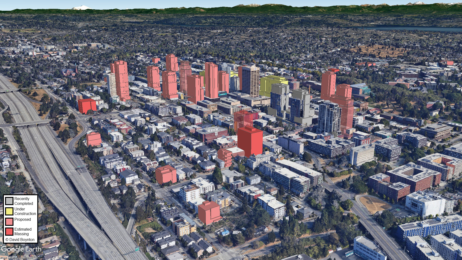 Rendering of U District with proposed tower development added to the skyline. Yellow are under constructure and pink are proposed. (David Boynton)