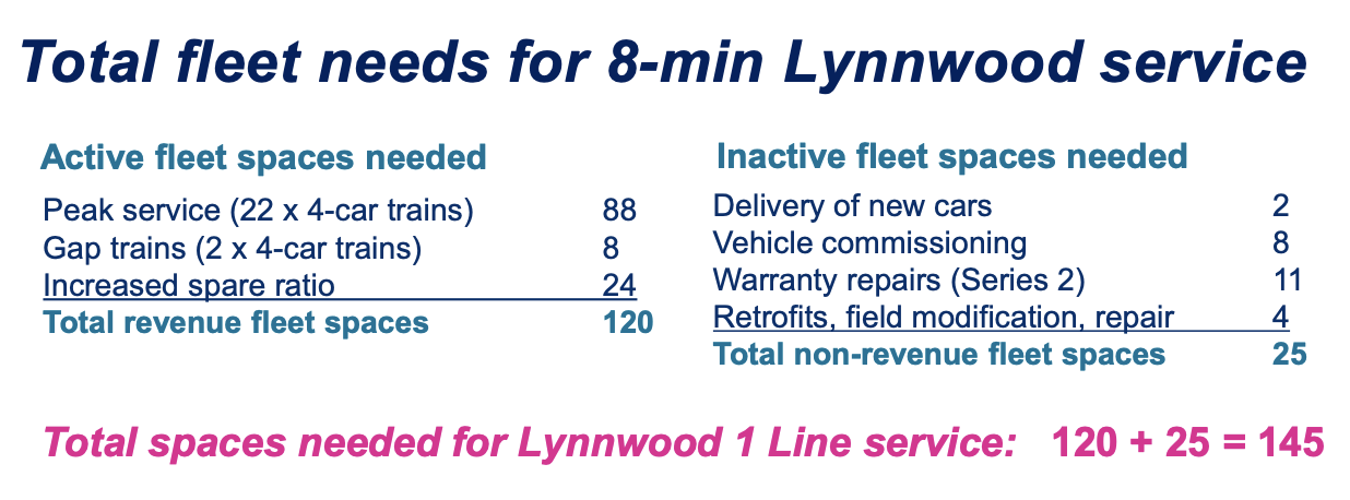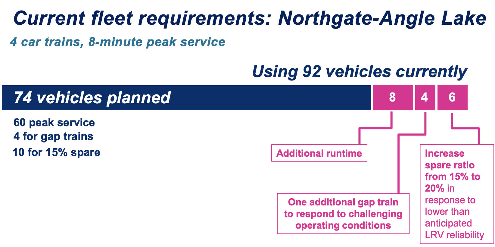 It appears that operational requirements are 24% higher than Sound Transit anticipated and means that the agency needs an extra 18 vehicles to fill several needs, though some of those may be passing issues as vehicles under warranty are fixed and targeted corrective measures are made to tracks.