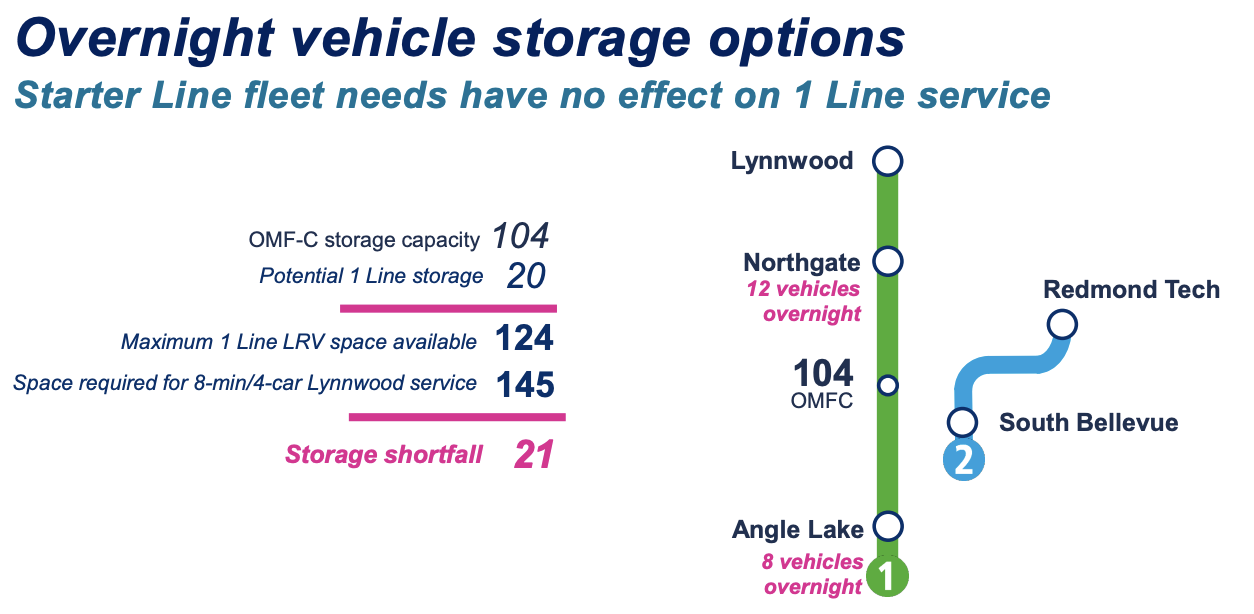 Sound Transit reports that there is only enough storage space at OMF Central for 104 LRV cars. Another 20 potential overnight spaces could be available at other locations, with 12 LRV cars at Northgate and eight LRV cars at Angle Lake. Unfortunately, that still leaves the agency with a shortfall of 21 storage spaces and ultimately not enough to accommodate eight-minute peak-hour headways using four-car trains for the initial service to Lynnwood — unless other locations could be used for overnight storage, such as Lynnwood and pocket tracks.