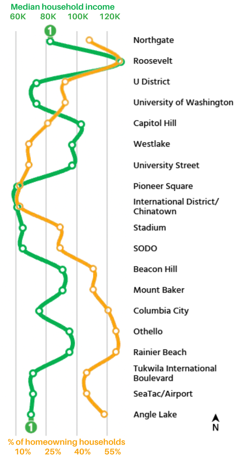 While home ownership and income fluctuate up and down along the route, race shows a relatively consistent pattern: the percentage of White non-Hispanic households decreases from around 60-70% at the northern end of the light rail to 30-40% at the south end. Today’s racial sorting is largely a holdover from redlining and racist lending practices that kept households of color out of North Seattle neighborhoods, as well as a mix of individual preferences and housing discrimination.