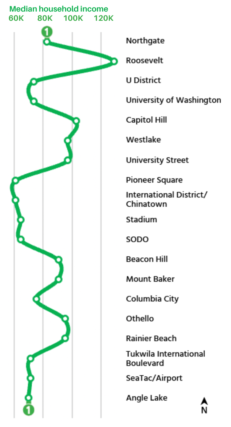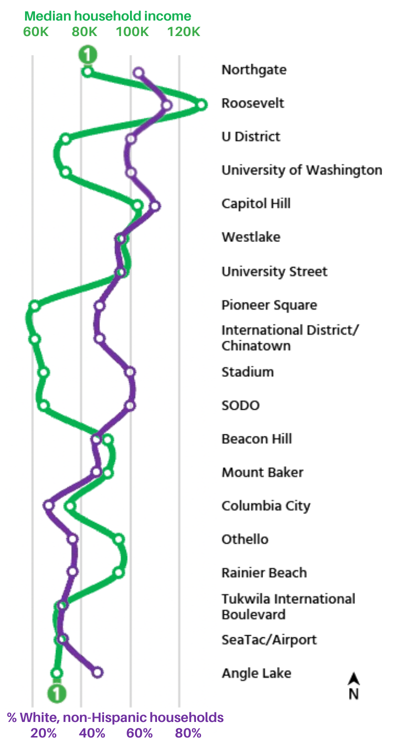 62% of Seattle residents identify as White and non-Hispanic. Neighborhoods across Seattle attract different demographics of residents, and race is no exception. A southbound ride on the 1 Line is also usually a ride from a Whiter neighborhood to a more racially diverse neighborhood.