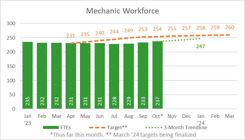 “To increase our training capacity, we’re increasing the frequency of classes and all of the resources needed to support that, including a new hiring process,” Switzer said. “We’ve also seen significant improvement in our mechanic hiring trends, including four months of month-over-month staffing increases; we have not seen a trend like this since before the pandemic.”