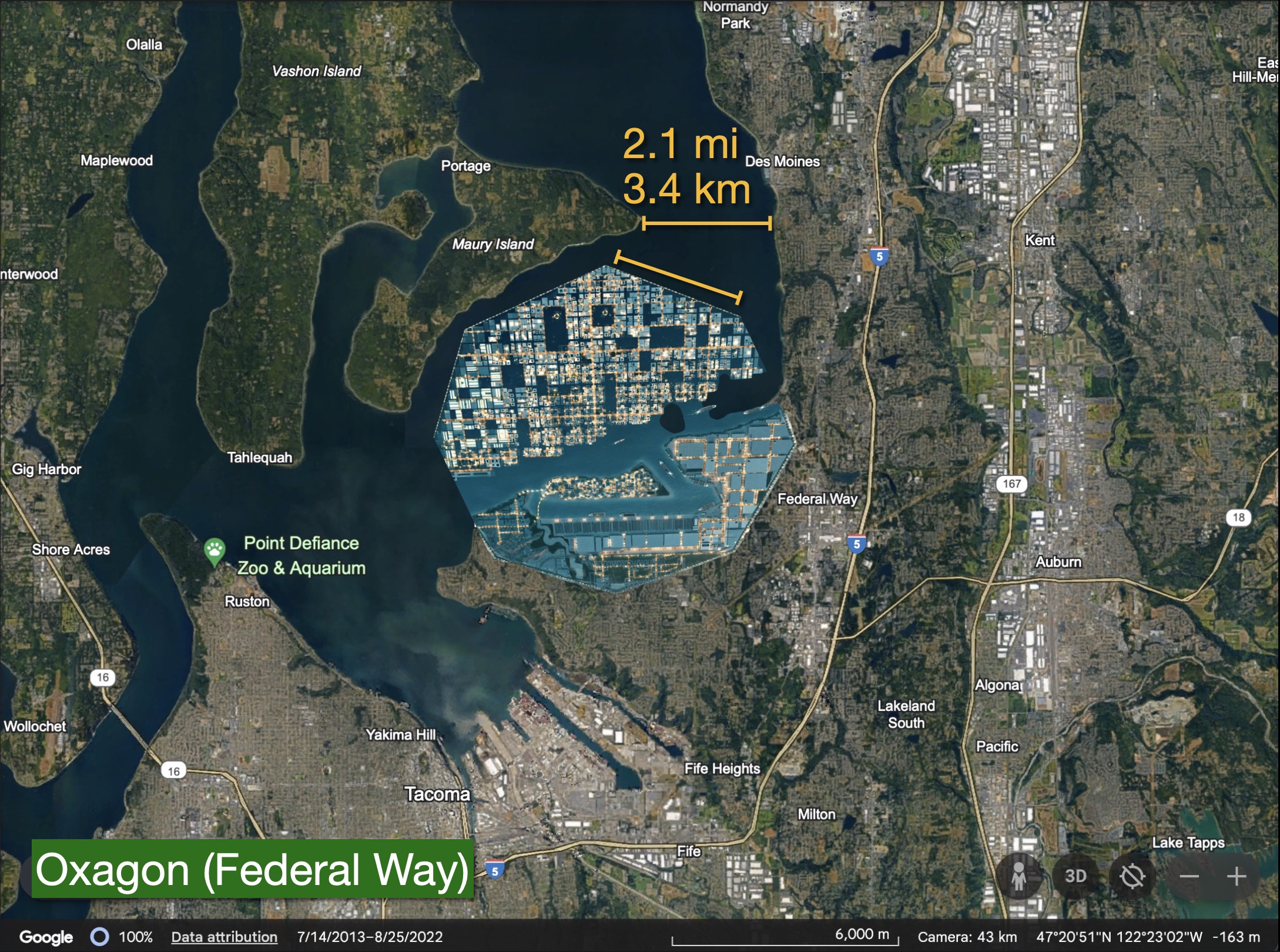 It is difficult to fit a complex the size of Oxagon into Puget Sound. The offshore component extends almost three miles (4.5 km) into the Red Sea. There ain’t that much space in the intricate confines of the Sound south of Seattle. Comparatively, a Puget Sound Oxagon would cover most of Federal Way west of I-5, and fill Puget Sound out to Maury Island. The depths of Puget Sound versus the Red Sea are interestingly similar, though, with both running 500-600 feet at these locations.