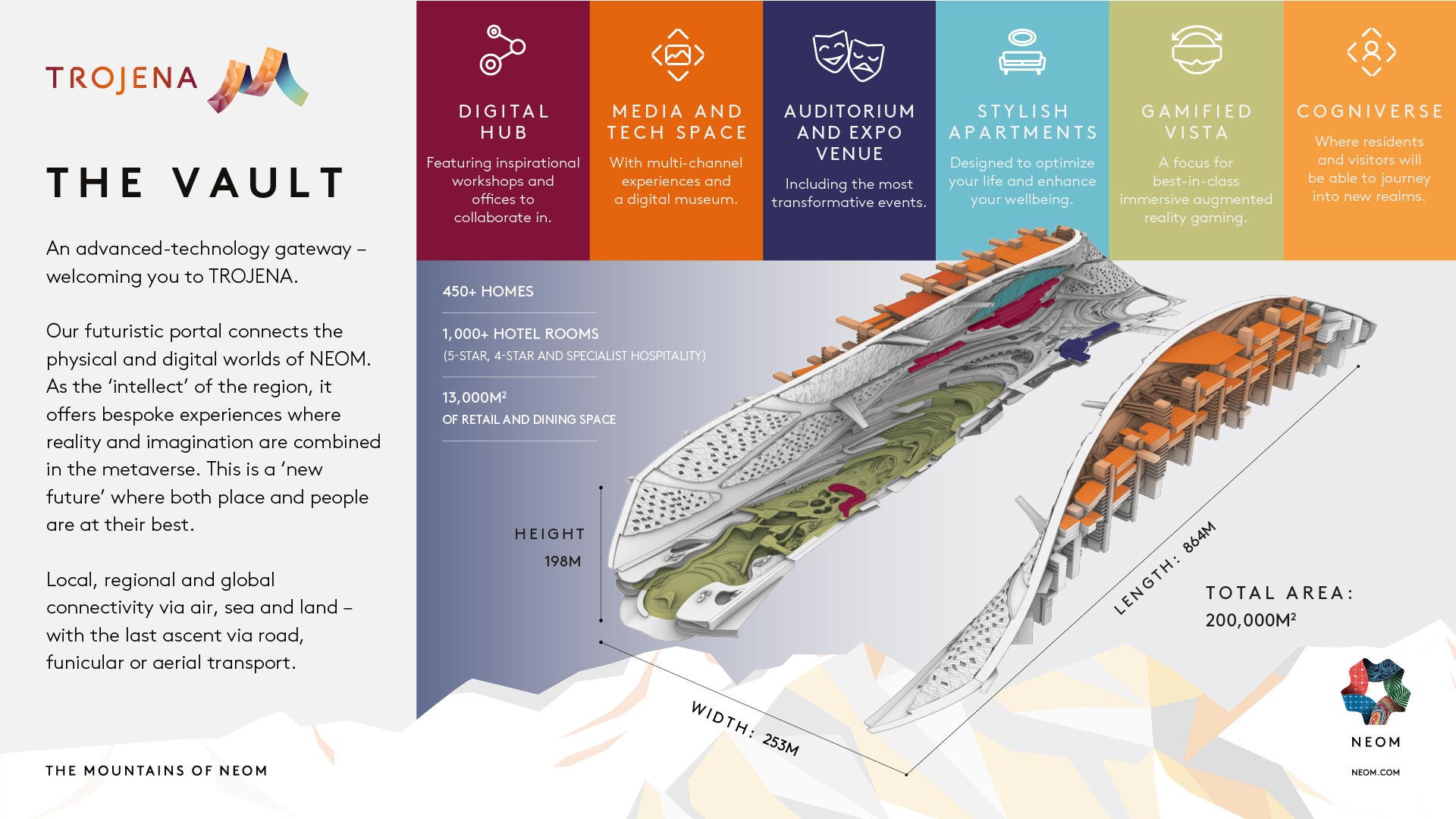 The Trojena project will insert a resort among the otherwise undisturbed Sarawak Mountains, around the peak, Jabal al-Lawz. The mountain itself will be topped with a spire designed by Zaha Hadid Architects. The portal to the resort is referred to as The Vault, a semi-enclosed taco of glass, augmented reality, and hotel rooms as tall as the Space Needle and the width of Lake Union.