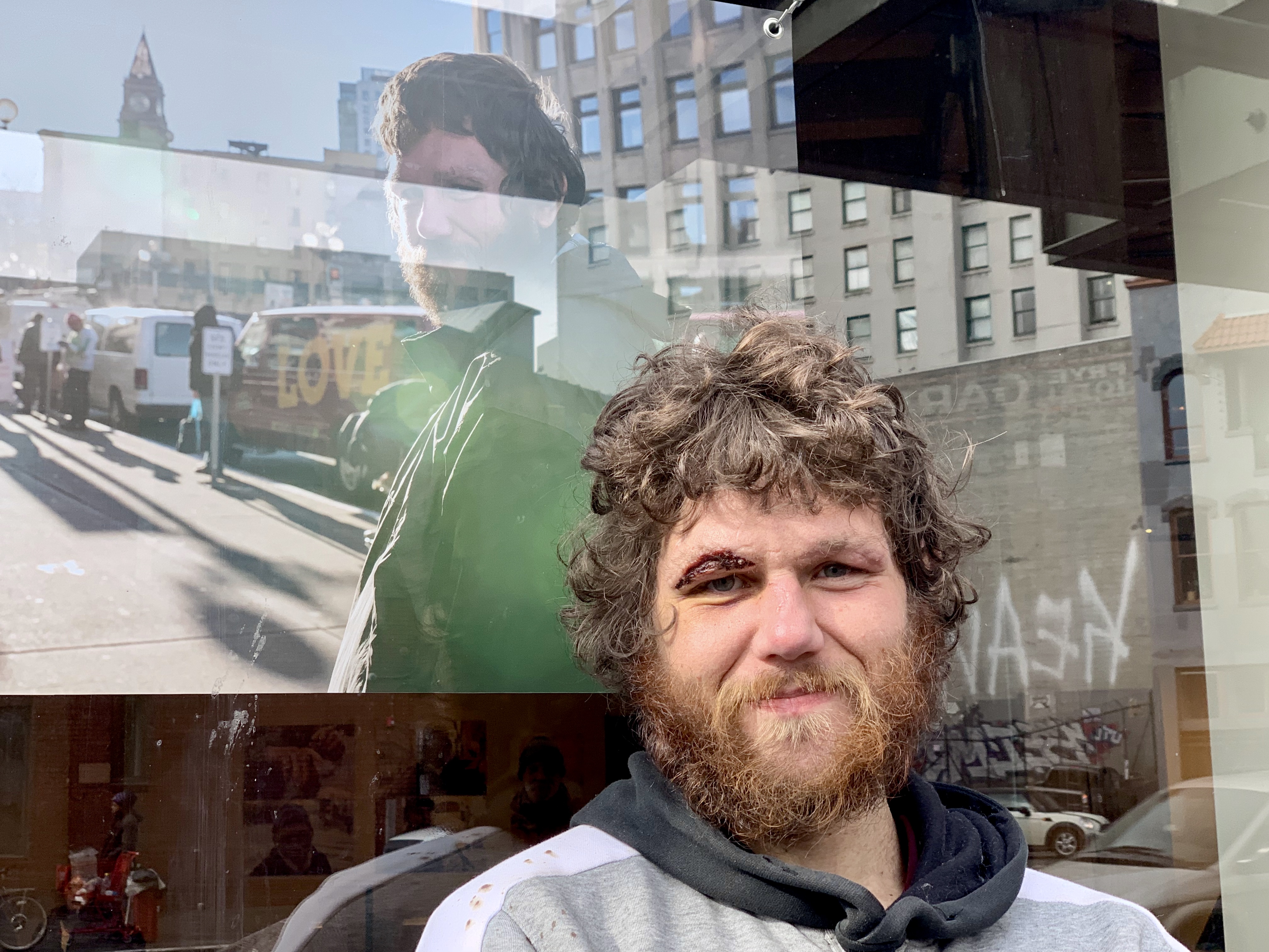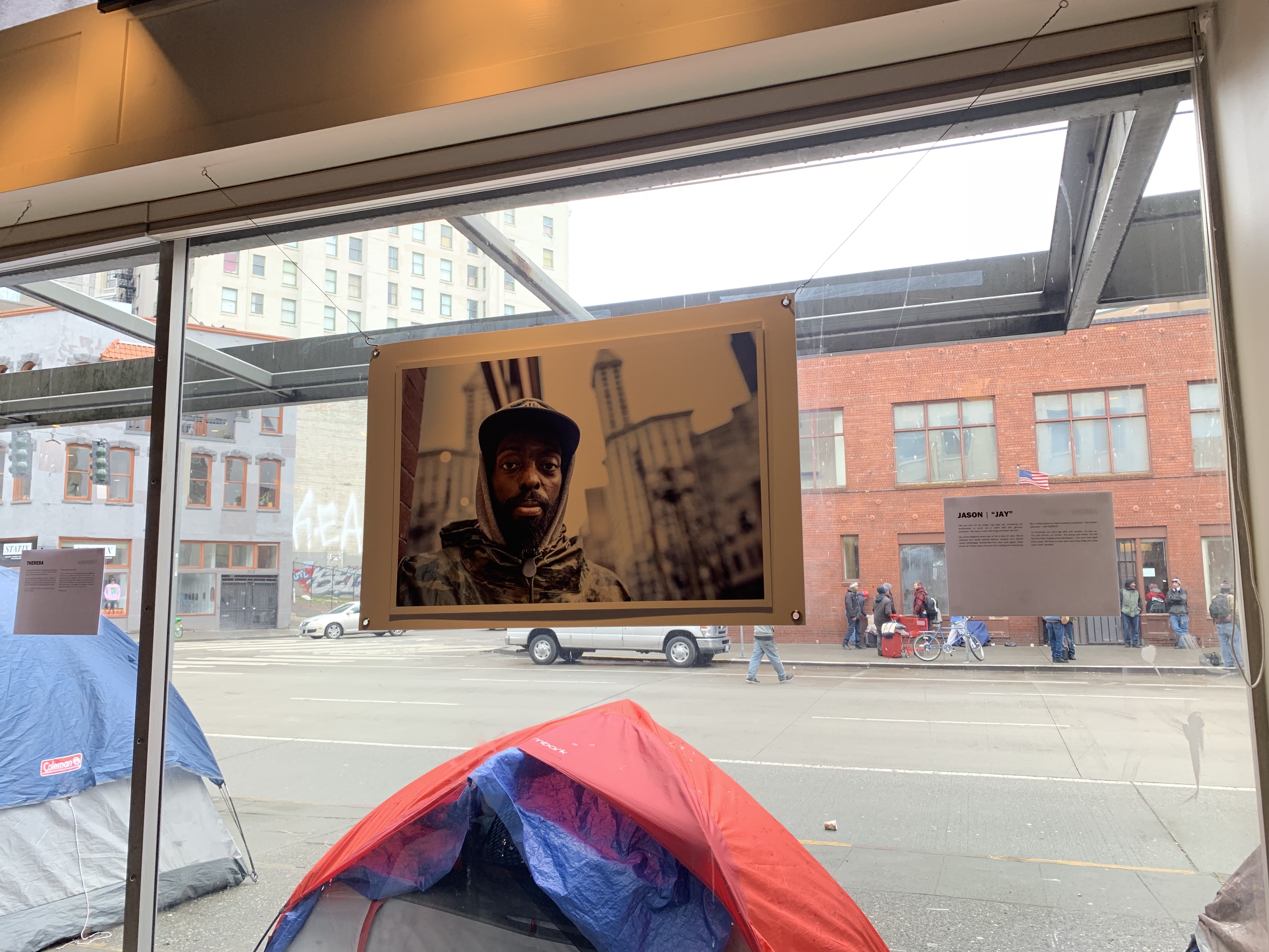 Kevin was proud to attend the opening of the Home Now exhibit in which he has been profiled. In addition to having his photograph and story shared through the exhibit, Kevin has become a beacon holder through the Samaritan.city app, which strives to make it easier for Seattleites to help one another. (Photo by author)