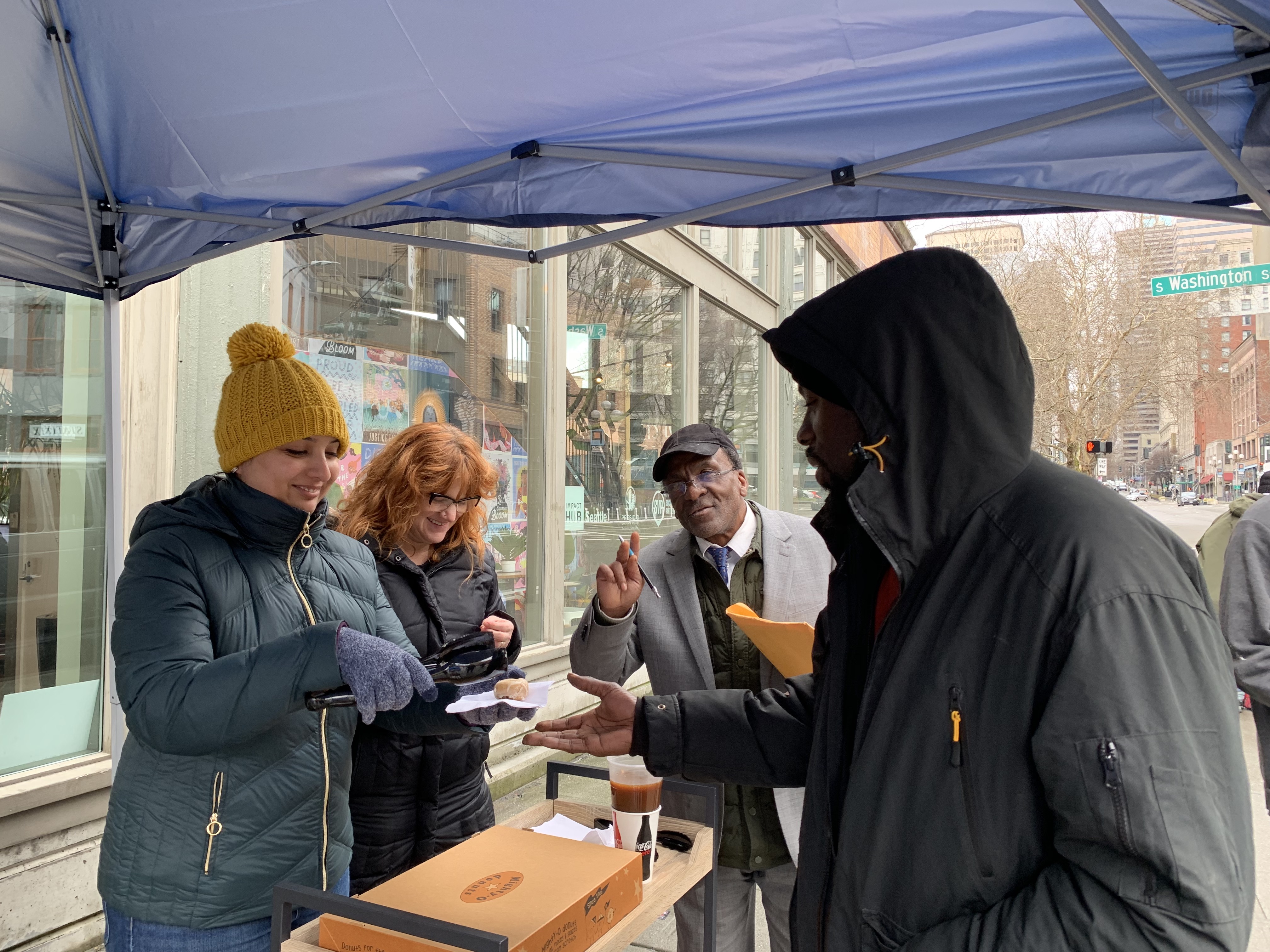 Neha Hora, staff member the Presidio Graduate School, and Rachelle Mee-Chapman serve coffee and Mighty-O donuts during the outside viewing of Home Now. Presidio is one of the tenants of the Impact Hub building and is involved with homeless outreach on both its Seattle and San Francisco campuses. (Photo by author)