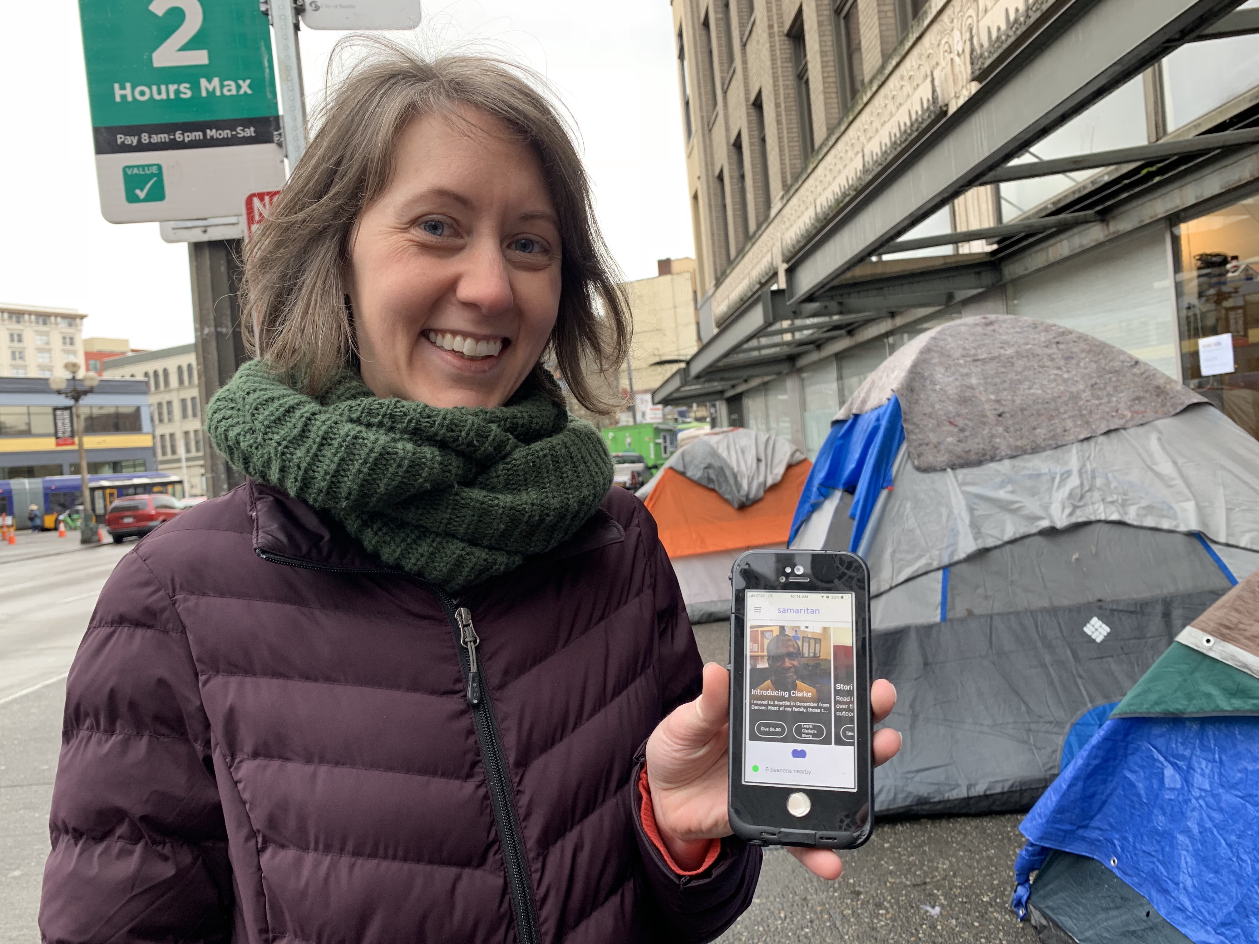 Jessica McCoy of Samaritan.city shows off how easy it is to use the Samaritan app. People who have downloaded the app receive a notification when a beacon holder is nearby. The app is intended to make it easier for Seattleites to help each other. (Photo by author)