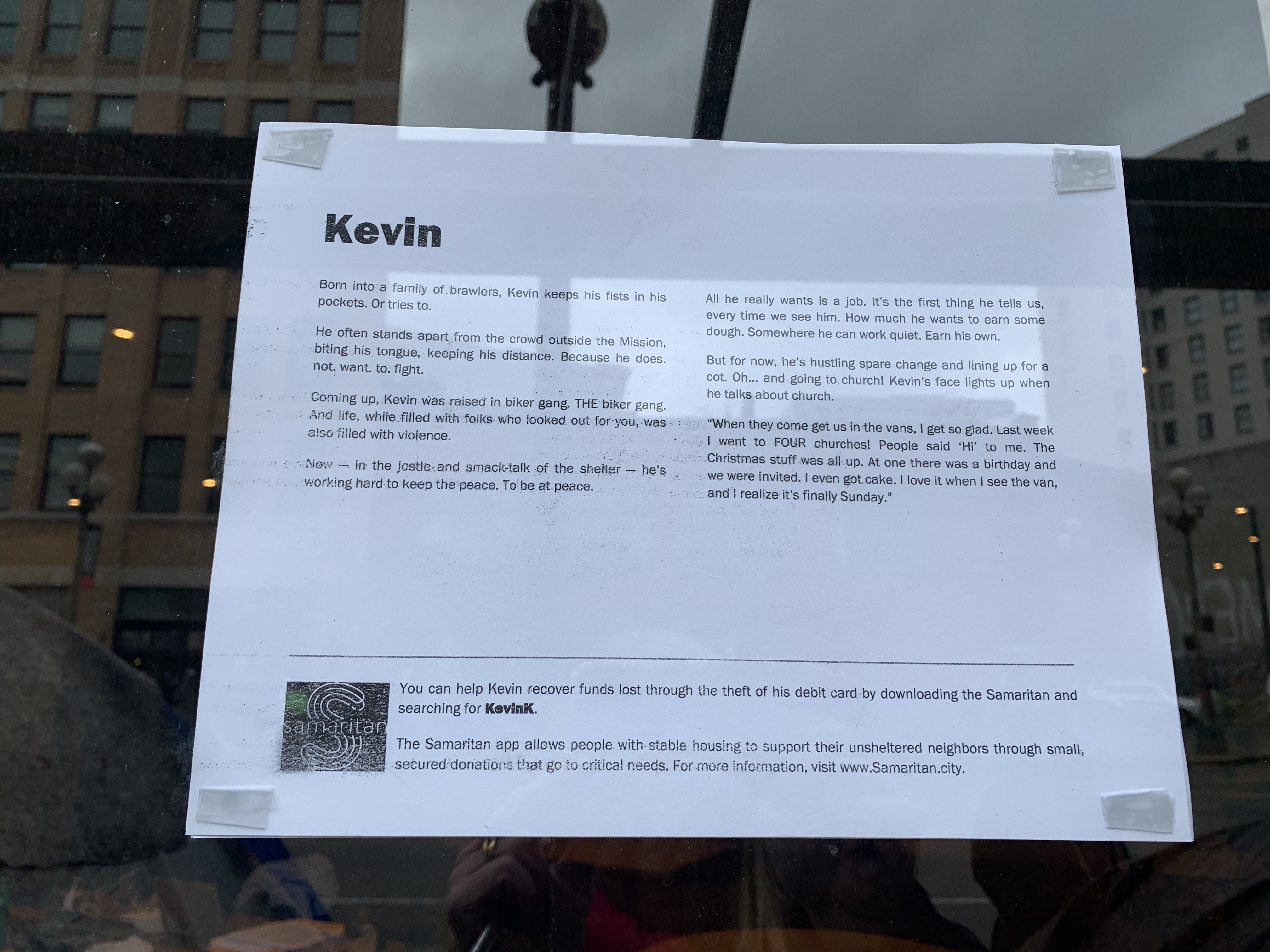 Exhibit viewers can both read Kevin’s story and learn how to help him through the Samaritan.city app. (Photo by author)