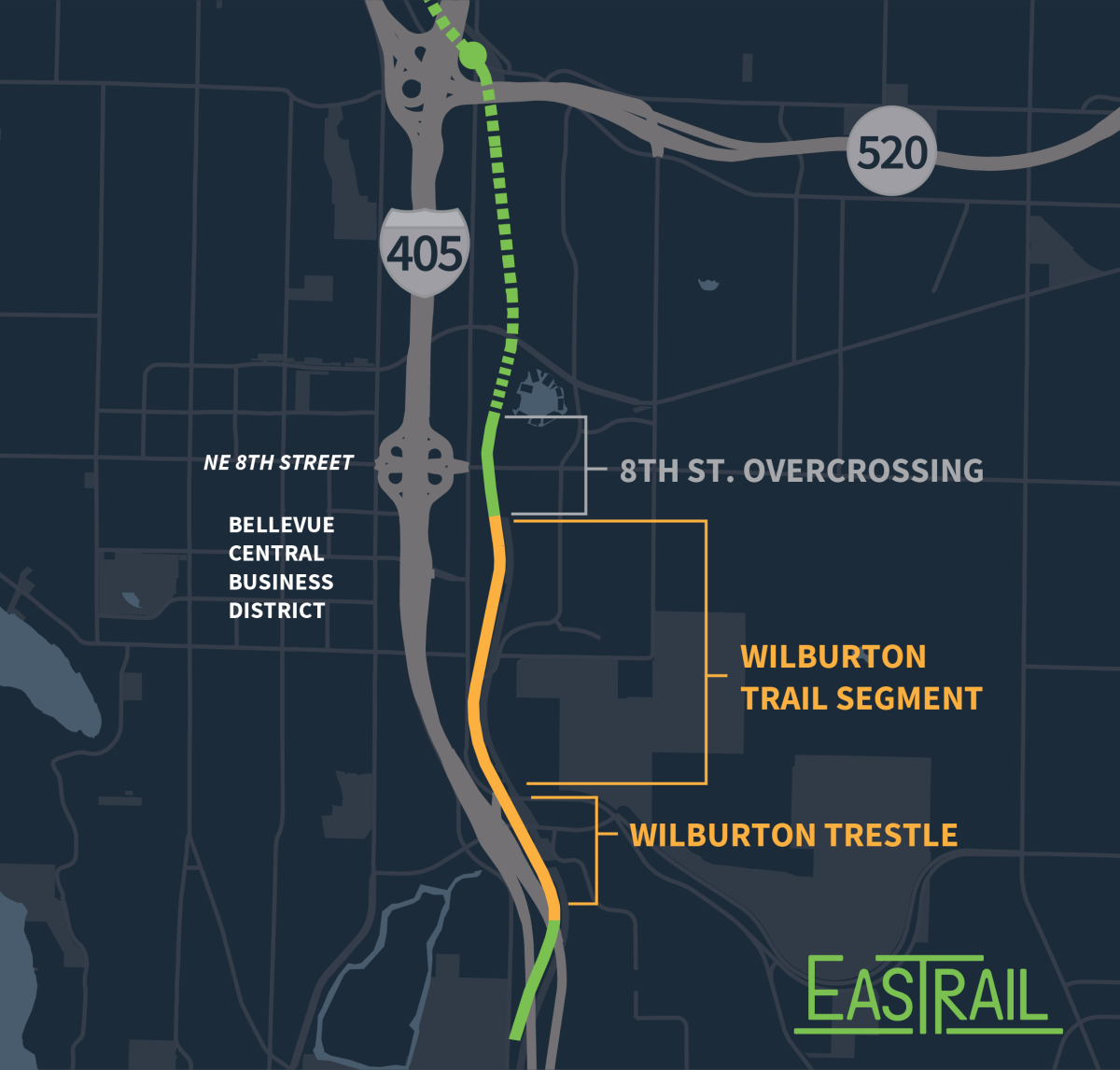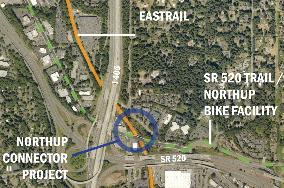 The small but impactful Northup Connector will allow people to connect directly from the Cross Kirkland Corridor or Eastrail in Bellevue directly to the bike facilities alongside 520 and Northup Way to head to Seattle or Redmond. (Eastrail Partners)