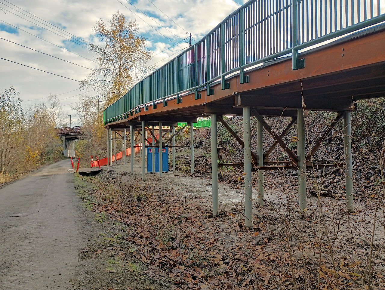 The new boardwalk will provide an easy way to connect from the Cross Kirkland Corridor to Bellevue’s on-street bike network or to head across the 520 bridge into Seattle. (Ryan Packer)