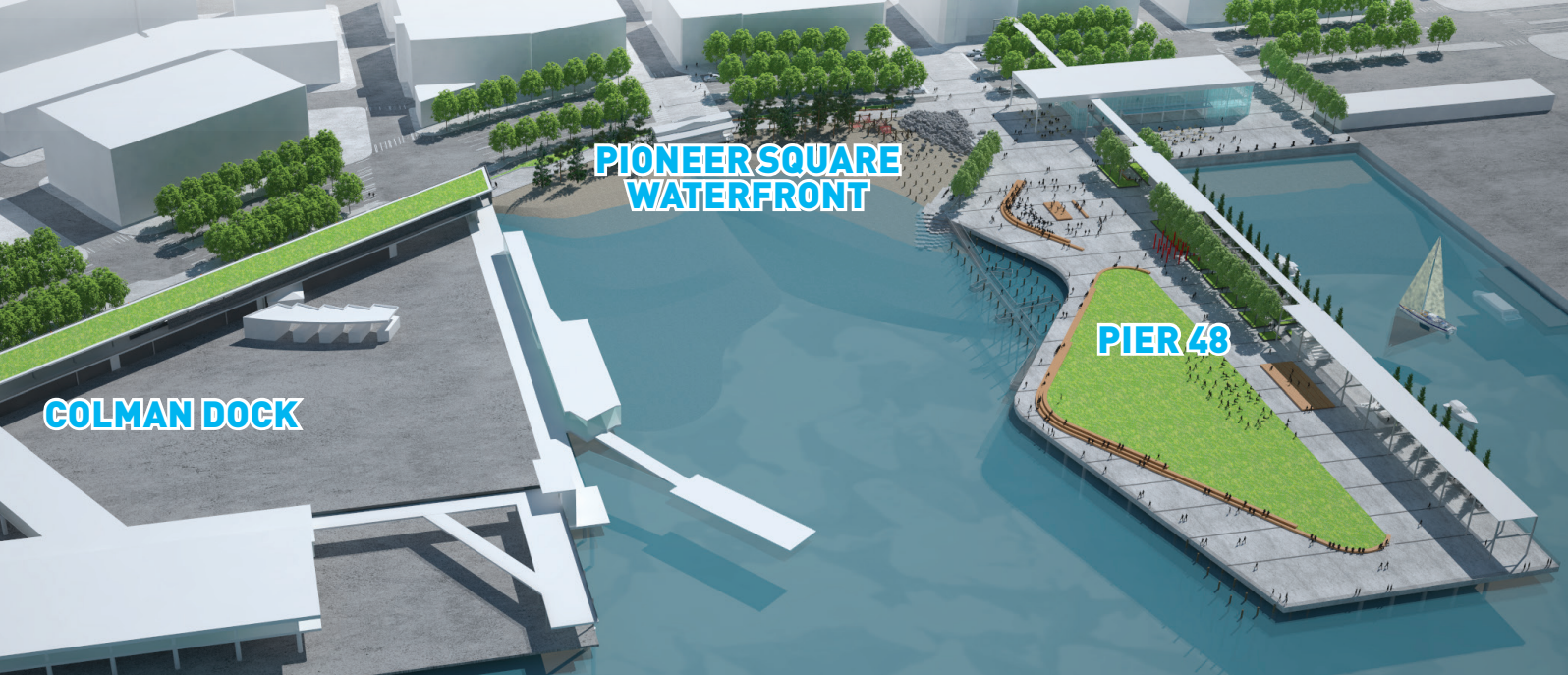 But just south of the new habitat beach, a long-underutilized property that’s outside the scope of the Office of the Waterfront’s work could provide another opportunity for additional public and open space in the vicinity of the envisioned Colman Dock multimodal hub. Buried among the laundry list of items moving forward in the latest iteration of Mayor Bruce Harrell’s Downtown Activation Plan last week was an acknowledgement that the City is still pursuing how it could take advantage of potential opportunities at Pier 48. “Explore the future use of Pier 48 as new open green space,” one bullet point noted in the Mayor’s fact sheet on the plan, under the category of “Creat[ing] a healthy, resilient, and green Downtown.”