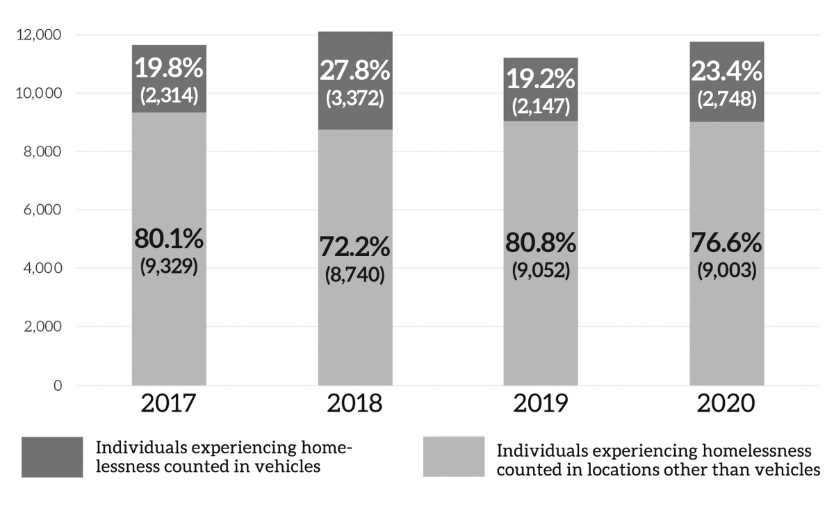 Vehicle residents constituted a fifth of people experiencing homelessness in 2020, and a larger percentage in 2018. Experts believe the number increased during the pandemic when vulnerable people lost housing. Percentages may not add to 100 due to rounding. (Henry Behrens, All Home)