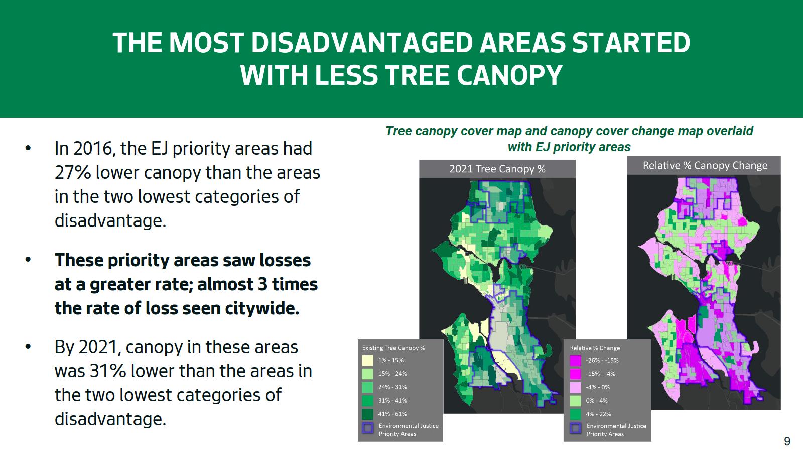 By applying an environmental justice lens to tree canopy in Seattle, the report found that areas that were less advantaged in terms of racial and economic inequality had 28% less tree canopy and also faced 31% more tree loss.