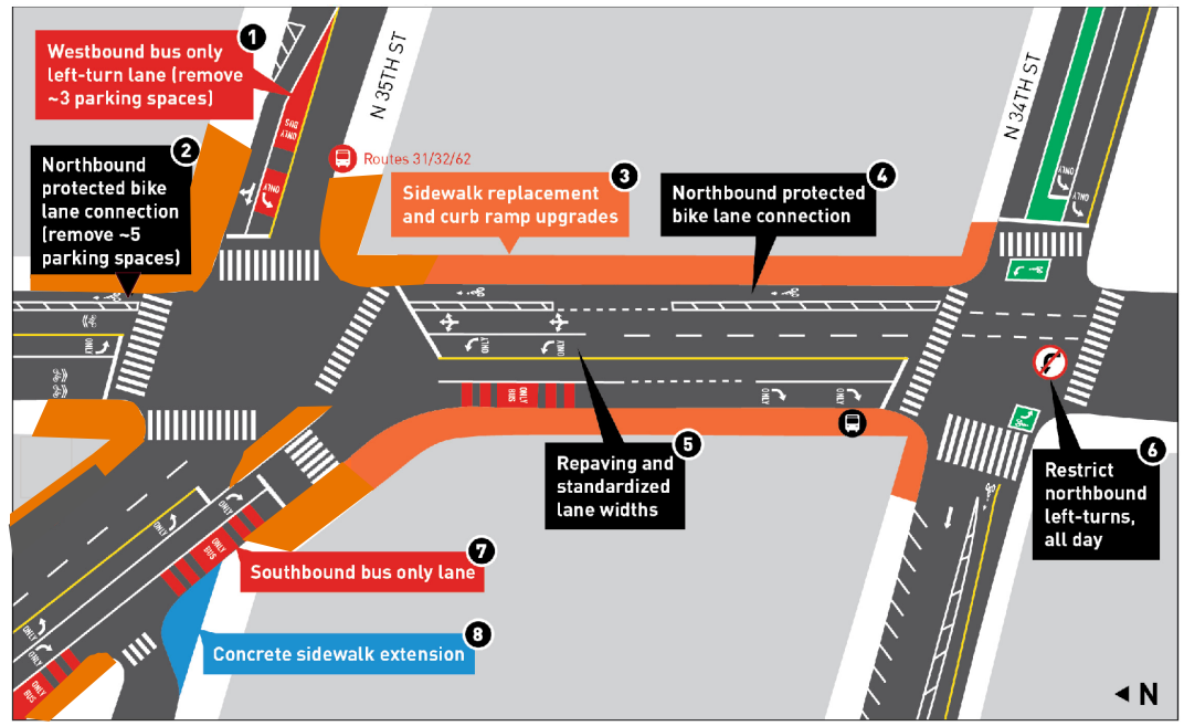 A high-profile project from the 2015 Levy to Move Seattle, Route 40 upgrades originally had been promised to voters as a full upgrade to a RapidRide corridor. However, the project's scope was scaled back due to funding constraints, but plans still proposed adding business access and transit (BAT) lanes, which prohibit general purpose traffic except drivers making right turns, along Westlake Avenue, N 35th Street and Leary Way.