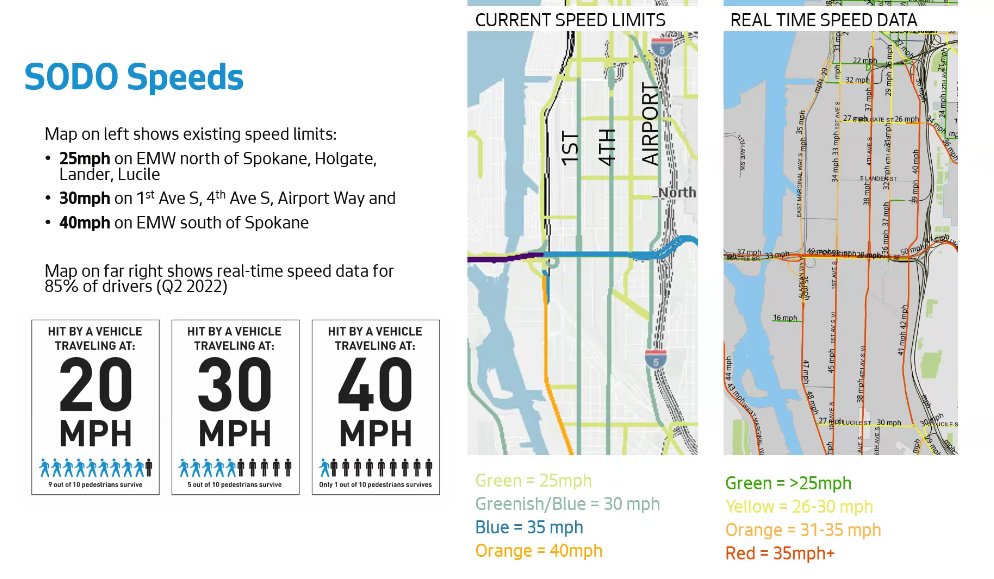 A clear reason that SoDo remains a hot spot for deadly crashes is vehicle speeds, exacerbated by the incredibly wide roads that cut through the industrial neighborhood. Data presented to the freight board showed most drivers in the neighborhood are exceeding posted speed limits, most substantially on the long, north-south corridors like 1st Avenue S and 4th Avenue S. Data collected in the area around 4th Avenue and Holgate showed that most drivers were traveled around 37 mph despite the 30 mph posted speed. As speeds increase from 30 mph to 40 mph, the likelihood of a pedestrian surviving a crash with a vehicle goes from 50% to 10%. It is not likely restricting turns will have a big impact on vehicle speeds, but turn maneuvers come with added risk when vehicle speeds remain this high.