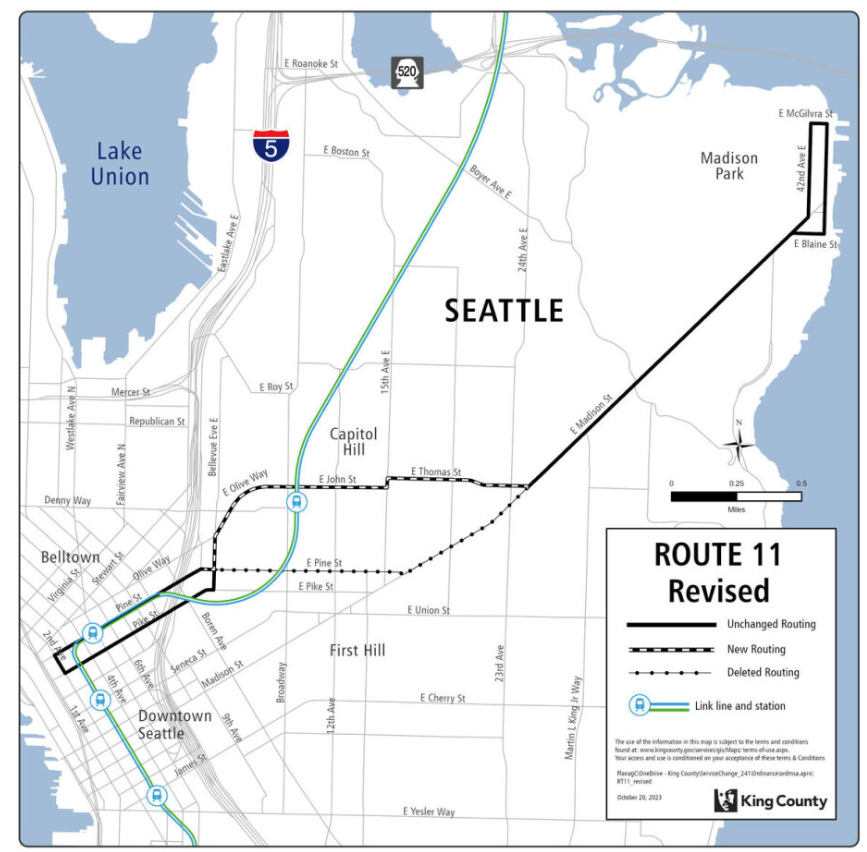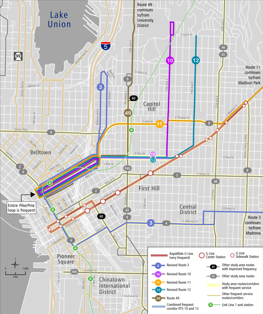 With the RapidRide G not extending all the way to Madison Park, the Route 11 will be moved off E Madison Street west of 24th Avenue E, increasing service along E Thomas Street between there and 15th Avenue E and taking over the routing of the current Route 10 along E John Street and E Olive Way.