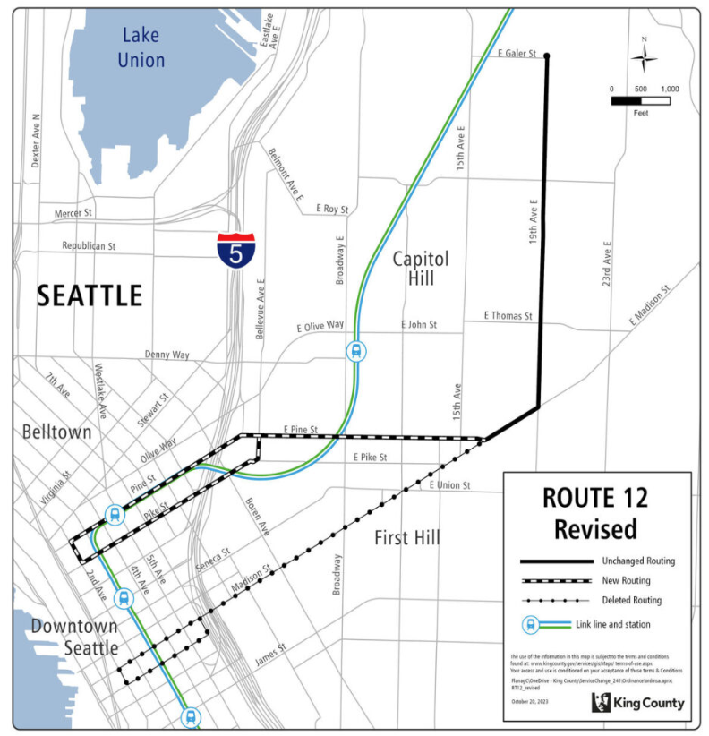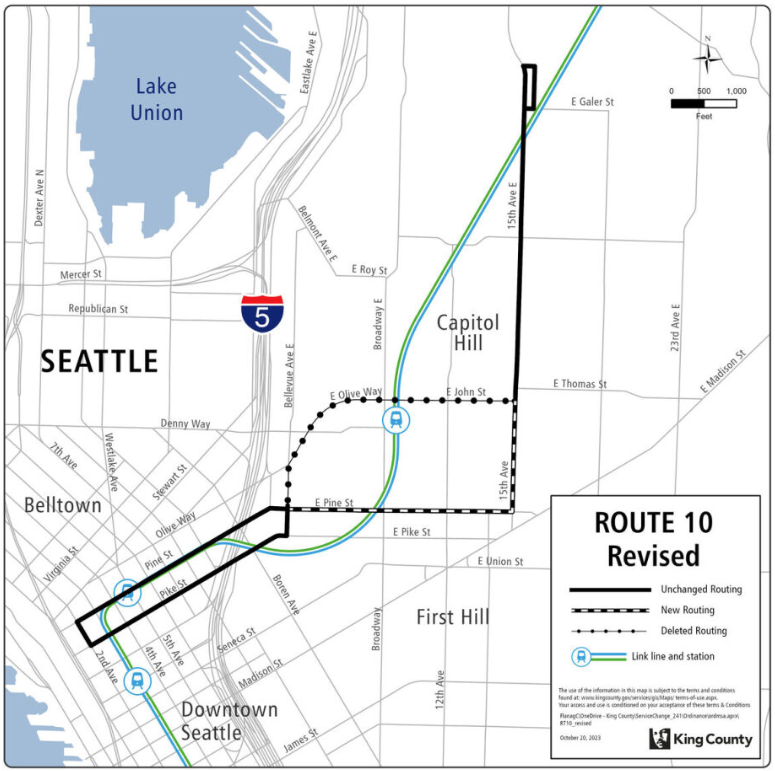 Service on the Route 10 to Volunteer Park would be rerouted off E Olive Way to E Pine Street, the pathway the route took prior to launch of light rail service at Capitol Hill Station. The change will provide more service to an area of the neighborhood that’s been lacking bus service, but will ultimately shift the route from providing a direct connection to light rail to falling short of providing a direct connection to the RapidRide G. Riders wanting to transfer between the 10 and the G will have to walk two blocks from 15th and Pine to 17th and Madison, the nearest set of G Line stops.