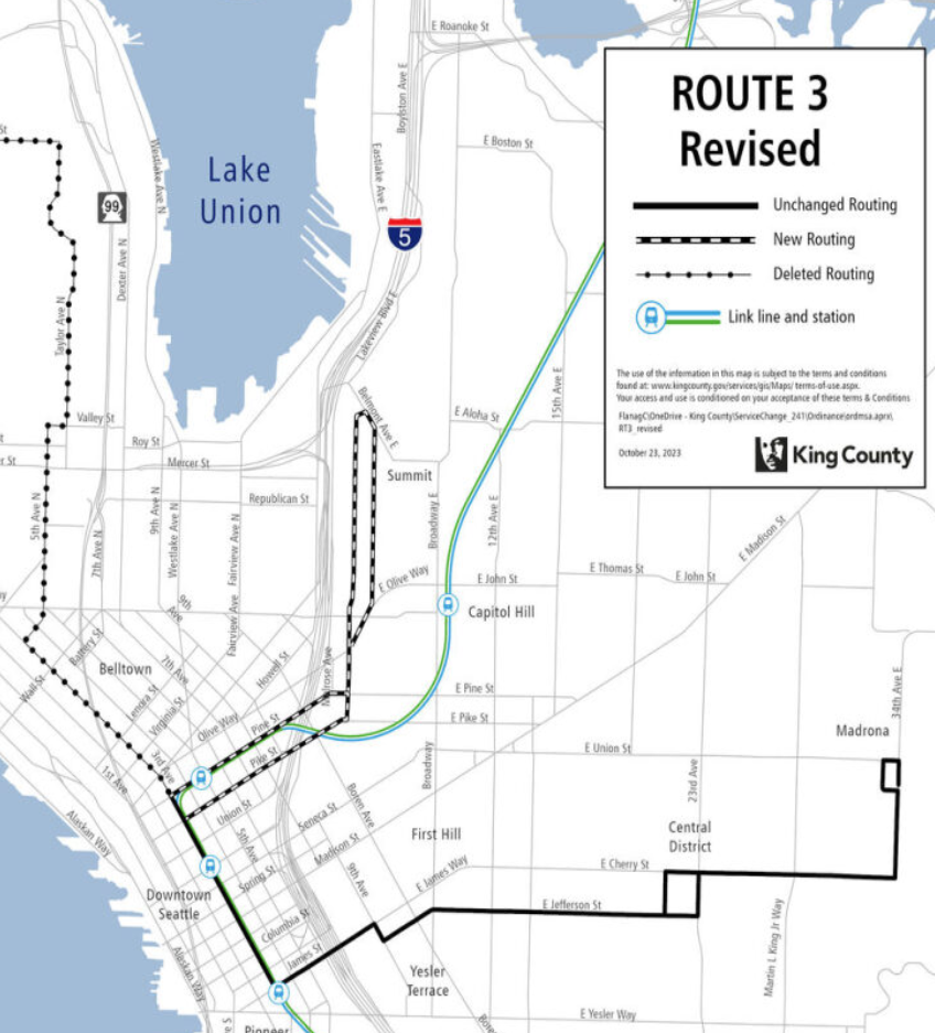 Route 3 service will only extend up into Capitol Hill every thirty minutes, and stop after 7:30pm on weekdays, 7pm on weekends. But, when it’s running, the new route will likely prove more useful than the former 47, which terminated at 3rd and Pine. Capitol Hill will have a new one-seat connection between First Hill and the Central District, and provide a better connection to Pioneer Square.