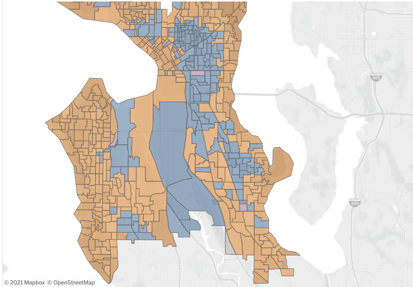 Harrell’s 17-point victory over Council President Lorena González was the most resounding, while Davison (the first Republican elected in Seattle in decades) won by just four points over abolitionist Nicole Thomas-Kennedy. However, the pattern of denser multifamily areas supporting more left-leaning progressive candidates remains pretty consistent across the races.