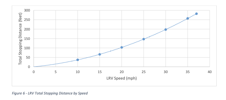 Graphic showing how many feet it takes to stop a light rail vehicle based upon speed. (Credit: King County)