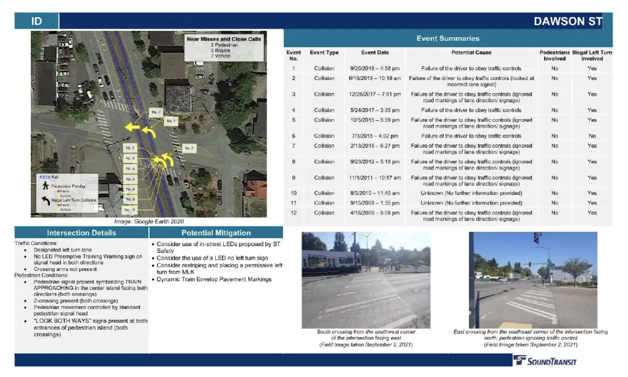 The technical report dives deeply intersection-by-intersection to discuss intersection details, collision events, and potential safety mitigation treatments. The latter is intriguing because it gives a window into actions that Sound Transit and partner agencies might take in the future to improve safety. Examples identified in the technical report include: