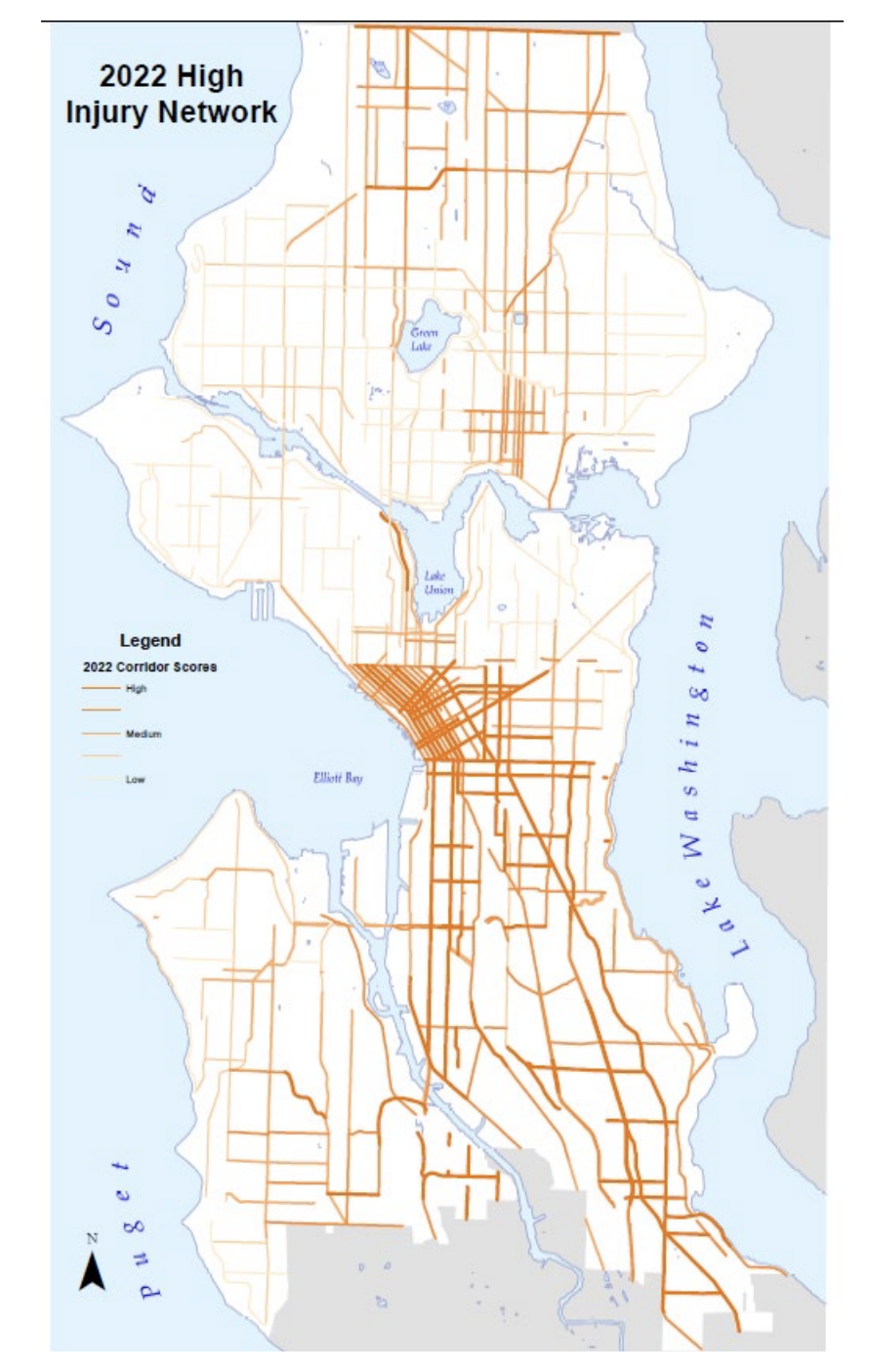Martin Luther King Jr. Way S lights up mostly as “high” in the Seattle Department of Transportation’s 2022 review of the city “high injury network” map. (Credit: City of Seattle)