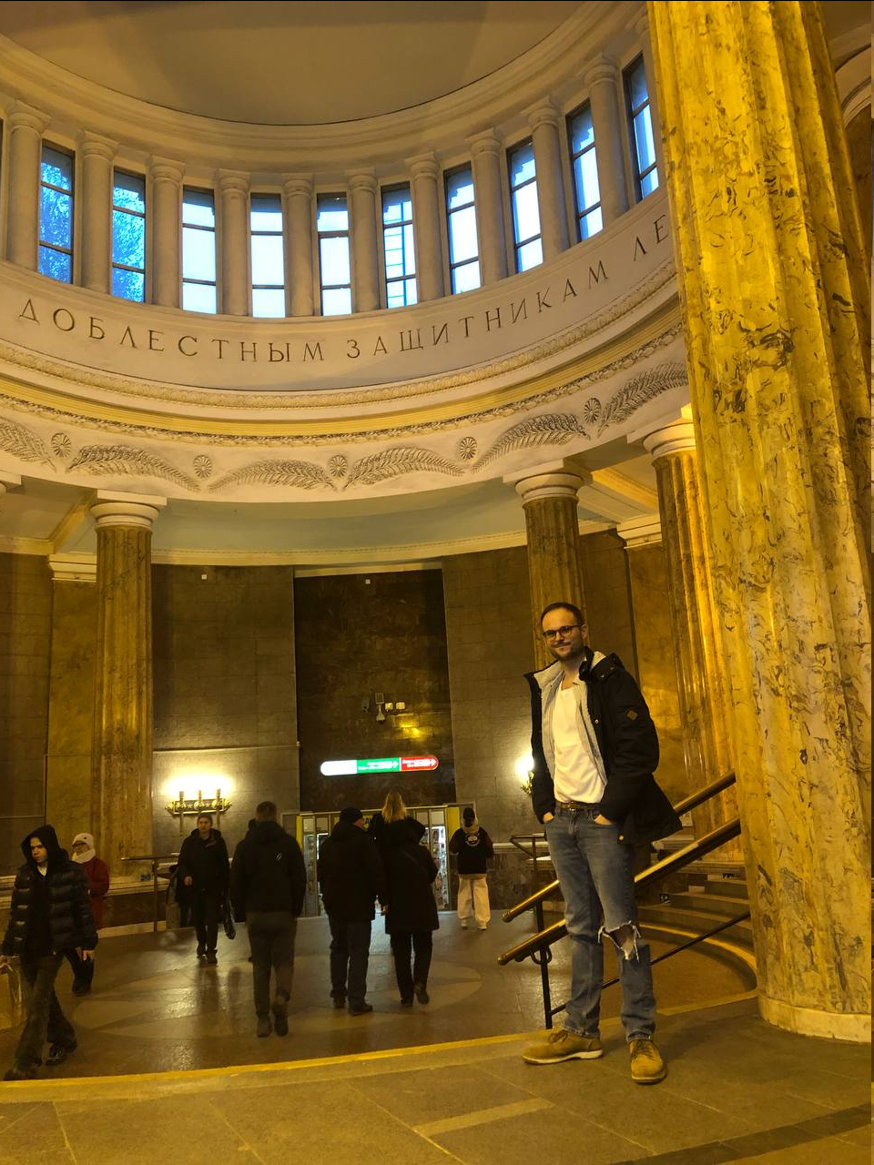 Photo of the author, Collin Reid at Avotovo station, a former cathedral repurposed into a building more frequented than any church in the city. (Inna Strinadkina)