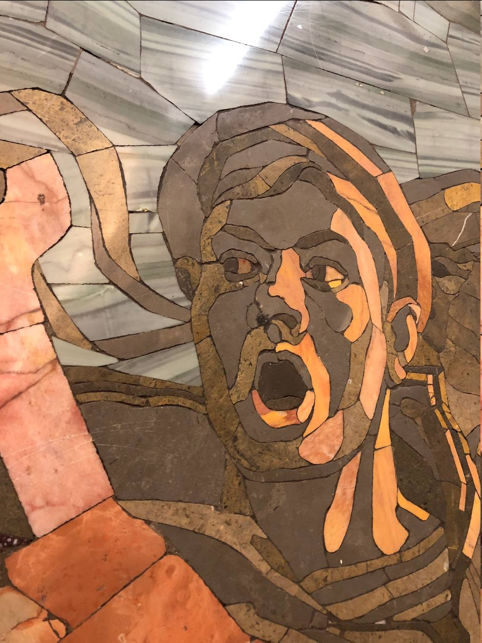 The mosaic depicting poet and playwright Mayakovskiy’s stark visage at the Saint Petersburg Metro station of his name. (Collin Reid)
