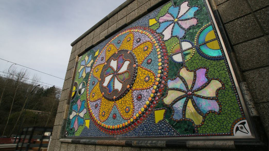 Mauricio Robalino’s “Pinwheel Mosaic” at Rainier Beach station beautifully represents the local Ecuadorian population and is perhaps one of the most aesthetically inspiring pieces of the system. It is a powerful statement of presence, and deserves supplemental projects which could better frame the historical context of this and other immigrant communities. (Sound Transit)