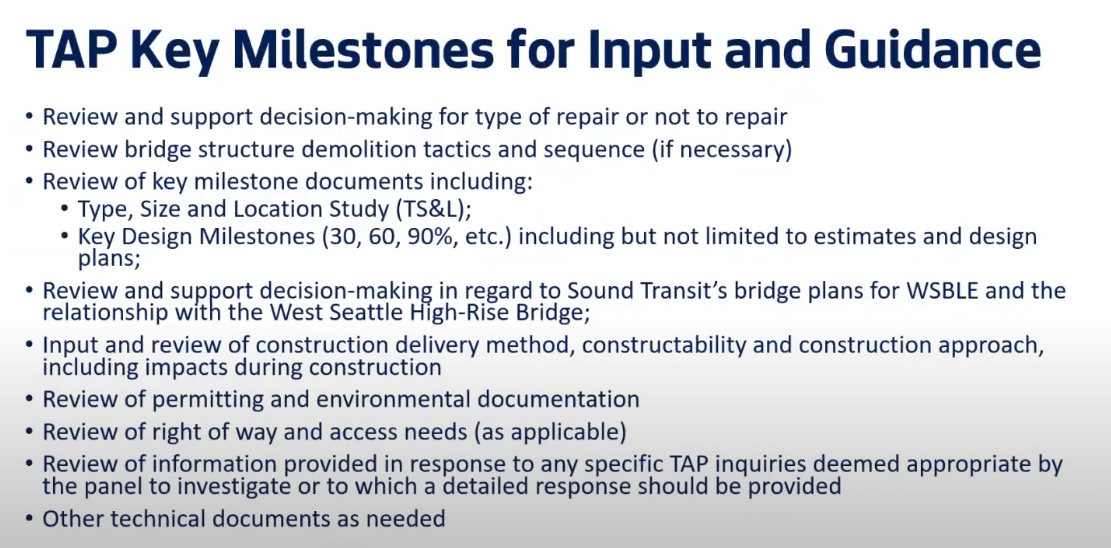The Technical Advisory Panel is consisted of independent experts in currently relevant fields, note that a transportation planner is absence from the panel’s current membership. They provide input and guidance on key decisions and documents. The TAP is currently working on a cost-benefit analysis with SDOT and are still collecting information to evaluate the tradeoffs between repair and replacement.