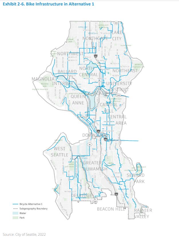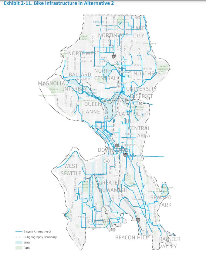 SDOT is studying three alternatives. Alternative 3 is dubbed, “Rapid Progress,” and delivers the fastest expansion of those emission-free transportation networks. The agency lays out the three alternatives as follows: