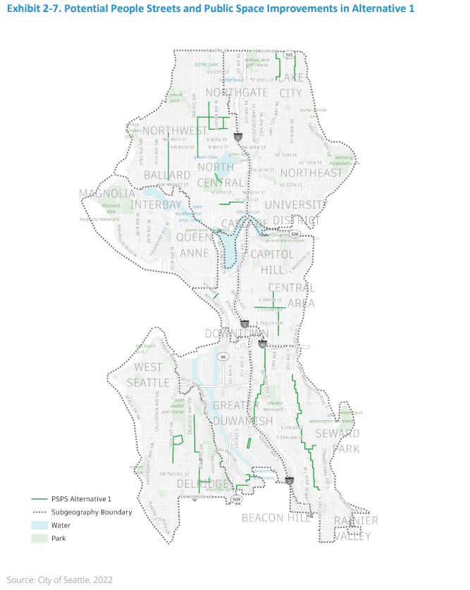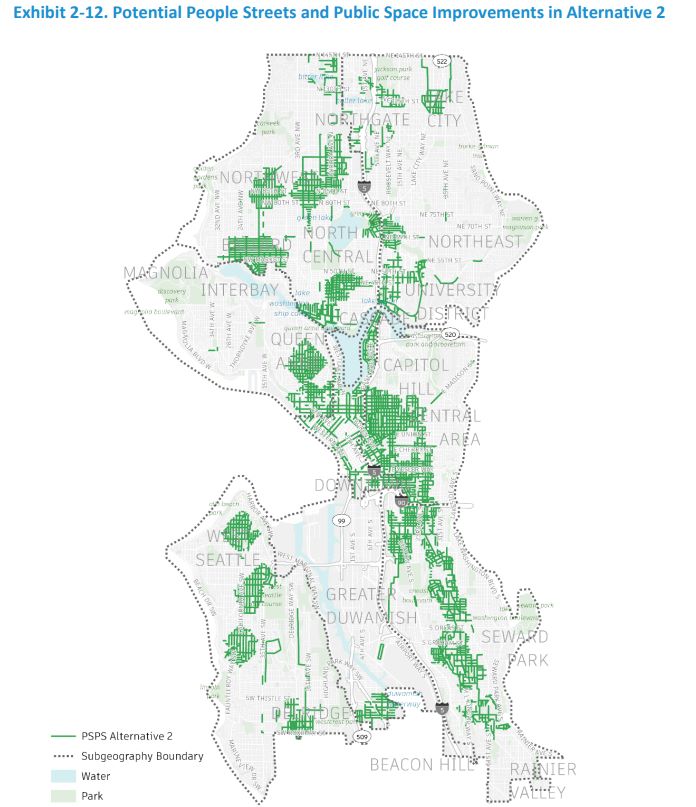 However, SDOT’s Alternative 3 is also less bold than an existing crowd-sourced plan that advocacy group, Seattle Neighborhood Greenways, released in 2020 with 130 miles of pedestrianized people streets to stitch a network across the city.