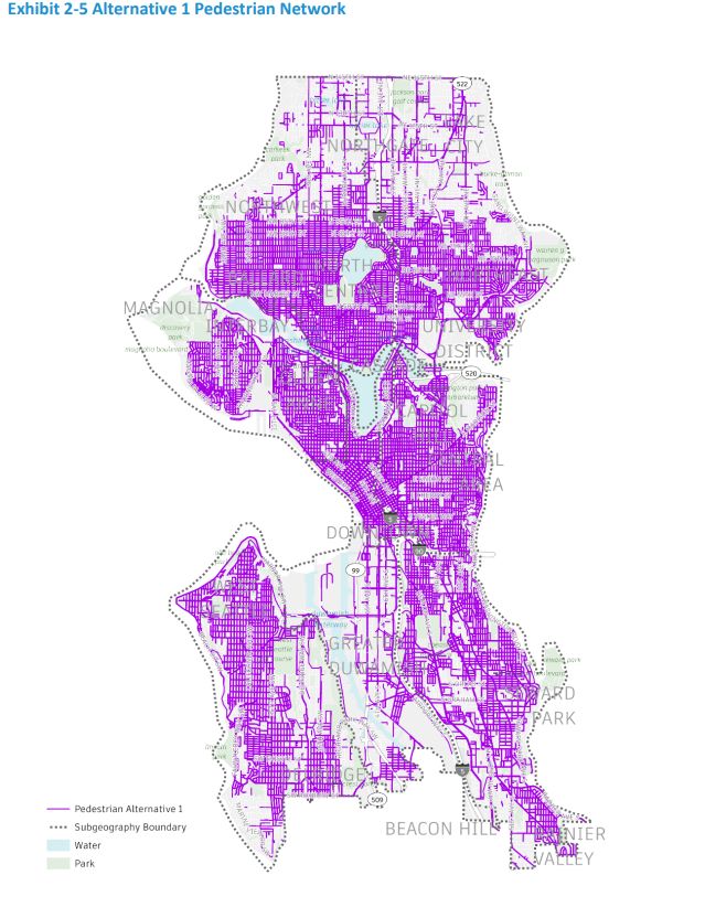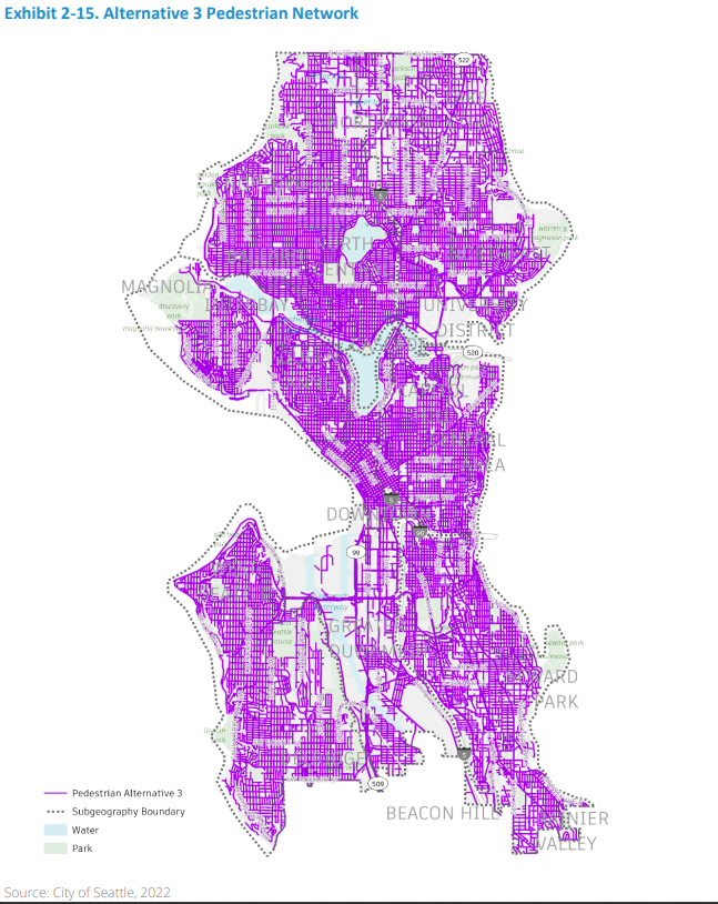 • Alternative 3 – Rapid Progress: “Alternative 3 focuses on the expansion of Seattle’s pedestrian, bicycle, and transit connections. The pedestrian network increases by 848 linear miles of sidewalks, the bicycle network adds 385 miles with facilities, an additional 76 miles of streets receive additional PSPS improvements, and an additional 123 miles are dedicated as transit corridors. In this alternative, the City fully implements overarching policies of the Seattle Transportation Plan with a greater expansion of PSPS, electrification infrastructure, a wider range of community and mobility hubs, and mobility management strategies in concert with the region. The existing freight network is expanded to include 19 miles of shared freight- and- bus (FAB) lanes.”