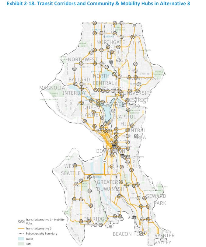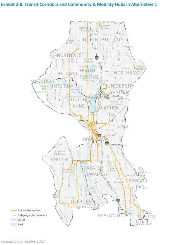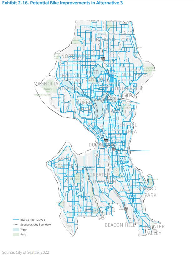 “Overall, Alternative 3 represents the most comprehensive and transformative approach to improving the City’s transportation network and is most supportive of broad changes to the land use pattern,” the City wrote. “Transit system improvements are also the most frequent, with the most dedicated transit corridors, light rail stations, and RapidRide corridors. This alternative introduces more EV charging infrastructure required in new development and additional EV infrastructure in public streets. These improvements create the most access to community assets in areas of the city beyond frequent transit corridors and outside of urban village/urban center boundaries.”