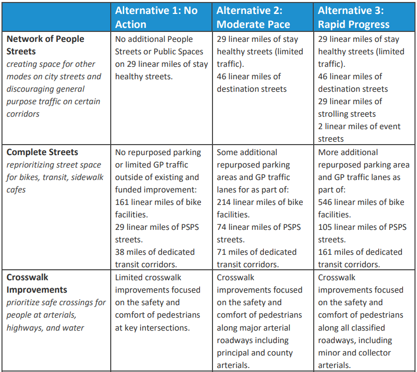 • Alternative 2 – Moderate Pace: “Alternative 2 allocates a moderate amount of new funding for multimodal infrastructure. The pedestrian network increases by 127 linear miles of sidewalks, the bicycle network adds 53 miles with facilities, an additional 45 miles of streets receive additional PSPS improvements, and 33 miles are dedicated as transit corridors. This plan includes some restricted areas for general purpose traffic, a network of People Streets, and a moderate number of community and mobility hubs. The existing freight network is unchanged.”