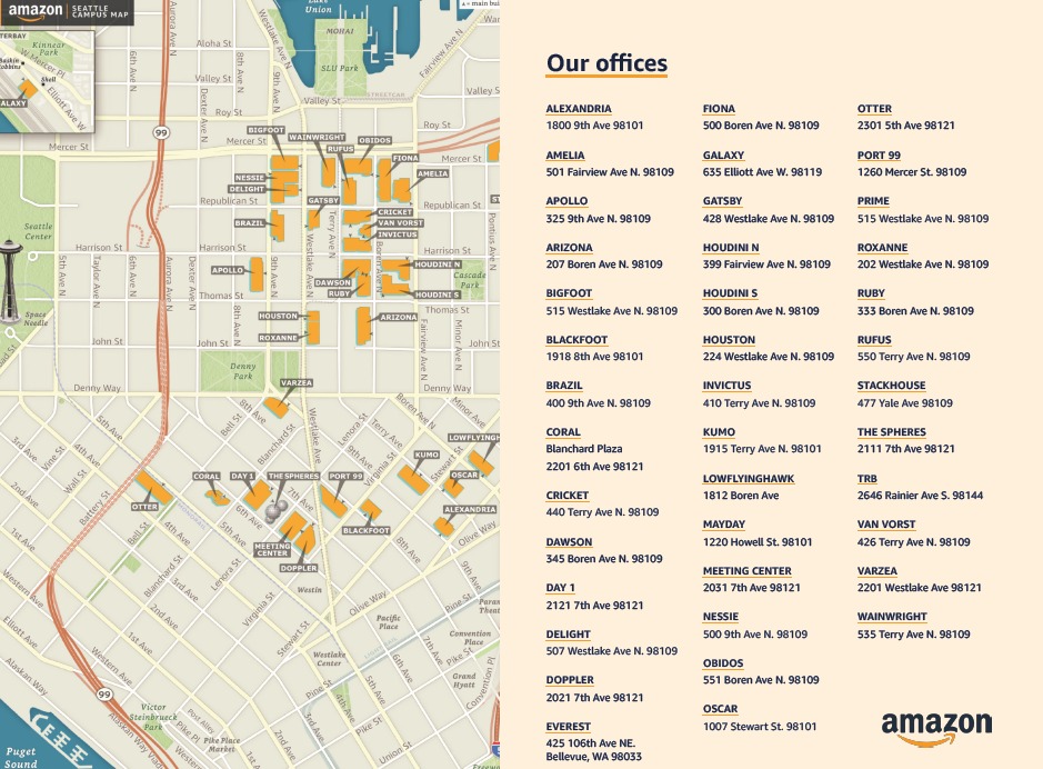 Amazon has a huge office footprint with space for 55,000 employees in Seattle’s South Lake Union and Denny Triangle neighborhoods. (Amazon)