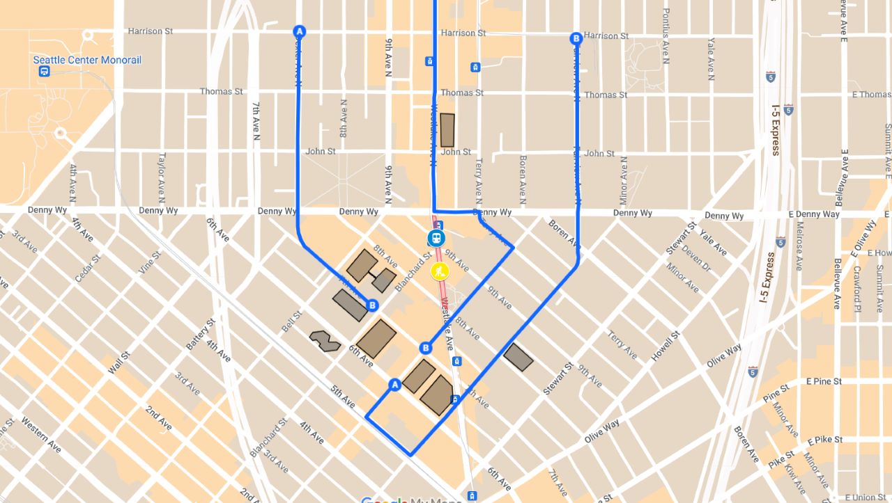 That said, the large parking garages at Amazon’s “Day 1” flagship office tower next to the Amazon Spheres and its nearly Doppler Tower would likely best be accessed from the north via Westlake Avenue. Of course, a driver could reasonably detour around a Westlake closure by using 7th Avenue, Lenora Street, or a variety of other options, as shown in the map above.