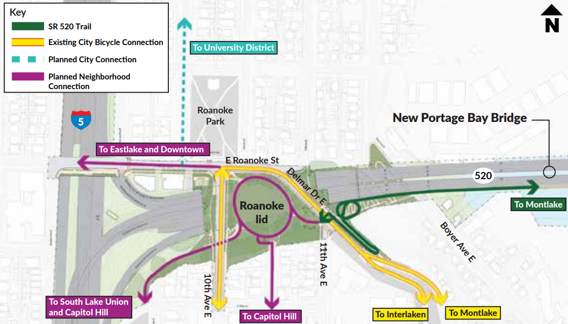 In addition, the new lid stitches back Seattle’s street grid in a way that creates other new connections, allowing someone on a bike to connect directly from Federal Avenue E in Capitol Hill, for example, with the connection to Eastlake or the North Capitol Hill greenway even if not connecting directly to the 520 Trail.