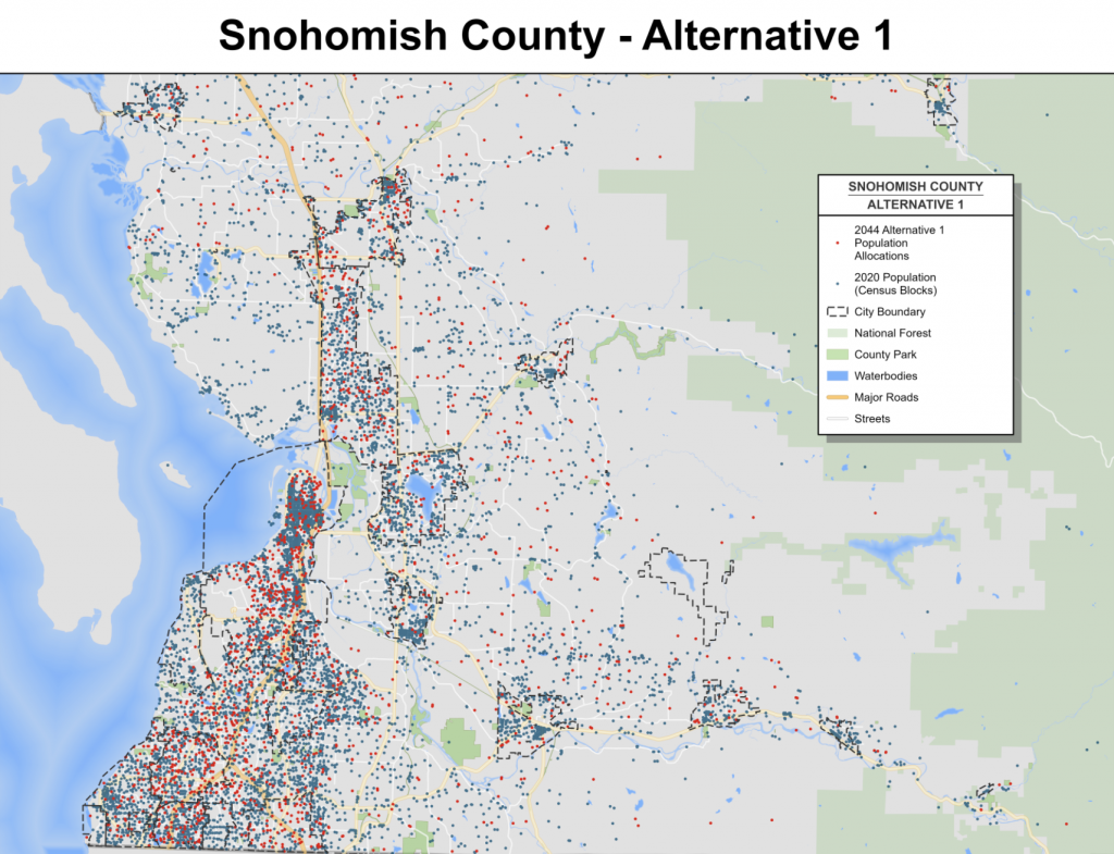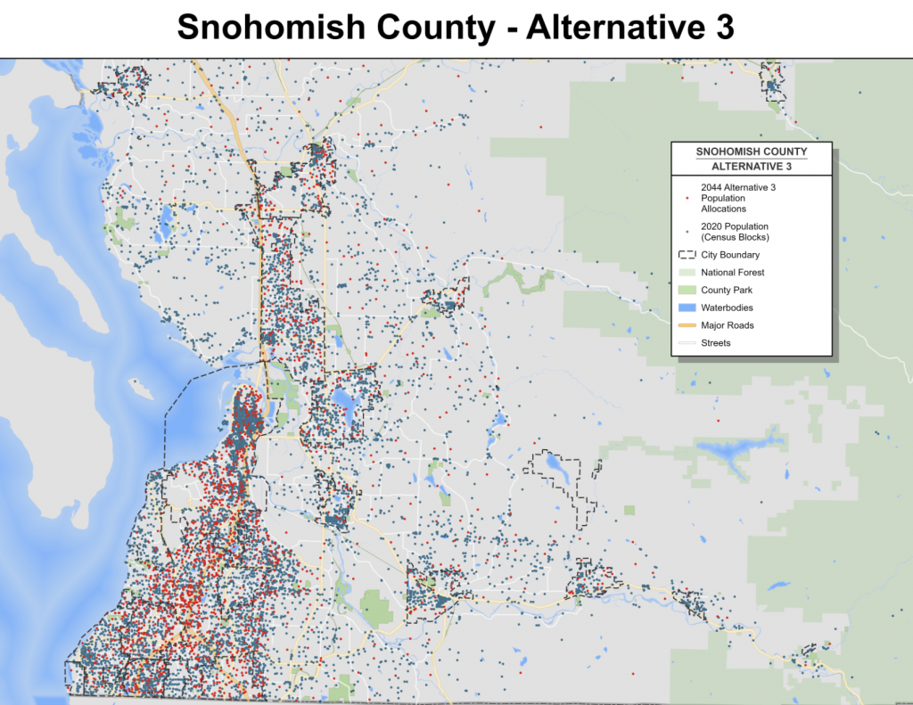 Like many local governments, Snohomish County has kicked off their comprehensive planning process to meet a state-mandated deadline to update the county’s 20-year growth plans. Known as the 2024 Comprehensive Plan Update, the county has begun its scoping process to identify differing alternatives to support growth in the years ahead. Three alternatives have been outlined as part of the initial scoping process, including two genuine growth alternatives that would support expected levels of population growth through 2044. However, one of those alternatives would open the door widely to much greater urban sprawl.