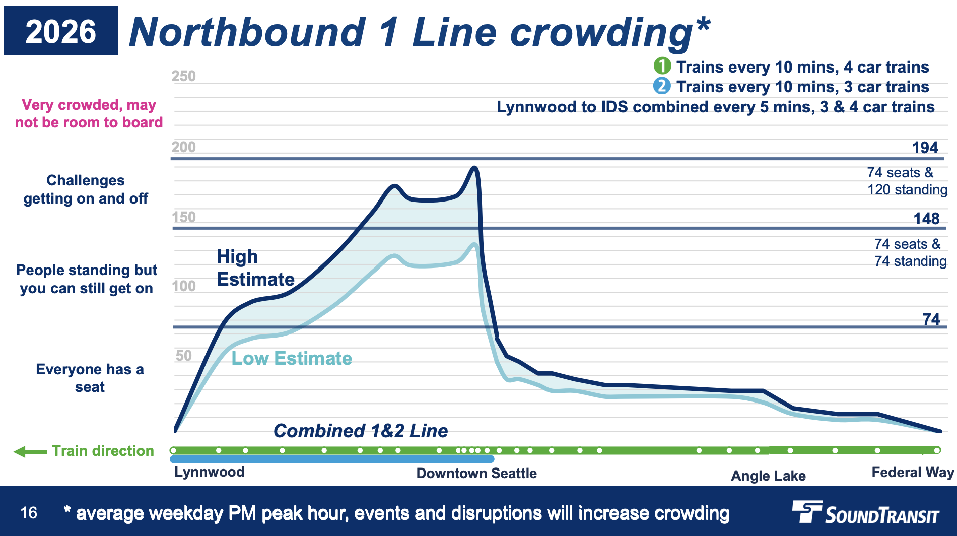 Crowding is forecasted to still be a problem on 1 Line in 2026, just not as severely as 2024, when the Federal Way Link Extension opens. (Sound Transit)