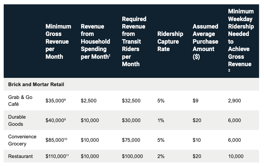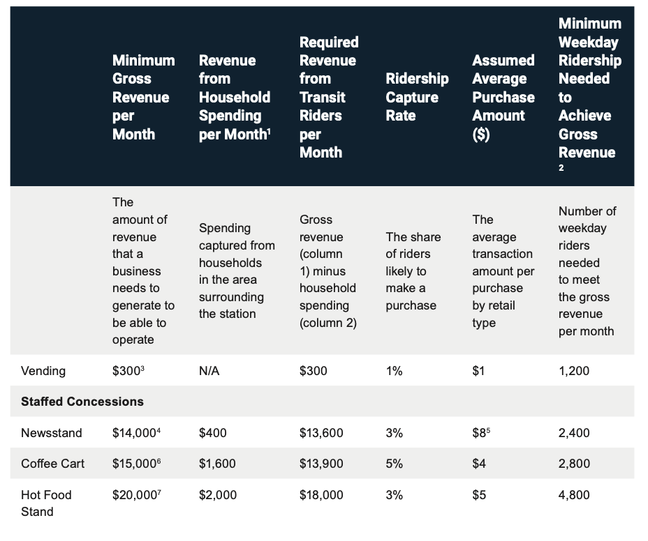 The report does go further to estimate foot traffic and revenue of different retail formats. Two tables are provided look at vending machines, staffed concessions, and brick and mortar retail. Each of these are assumed to require specific minimum gross revenue per month to be financially viable, the share are ridership captured, average purchase amount, and minimum weekday ridership needed. This all helps to understand what types of retail individual stations might reasonably be able to support in the future.