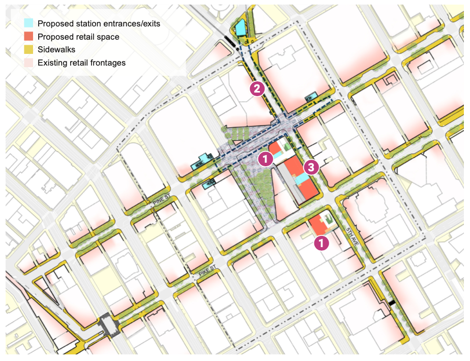 • Westlake: Retail at the station could be at street-level and underground in the station concourse, depending upon how a station is construction. The report models a scenario where the station takes down several buildings to make way for a new headhouse on 5th Avenue. Total retail square footage suggested is 65,000 with 20,000 at street-level and 45,000 underground. The report estimates that monthly rent from retail could top $196,000. Street-level retail would command a 25% premium over spaces in the concourse do higher passerby foot traffic.