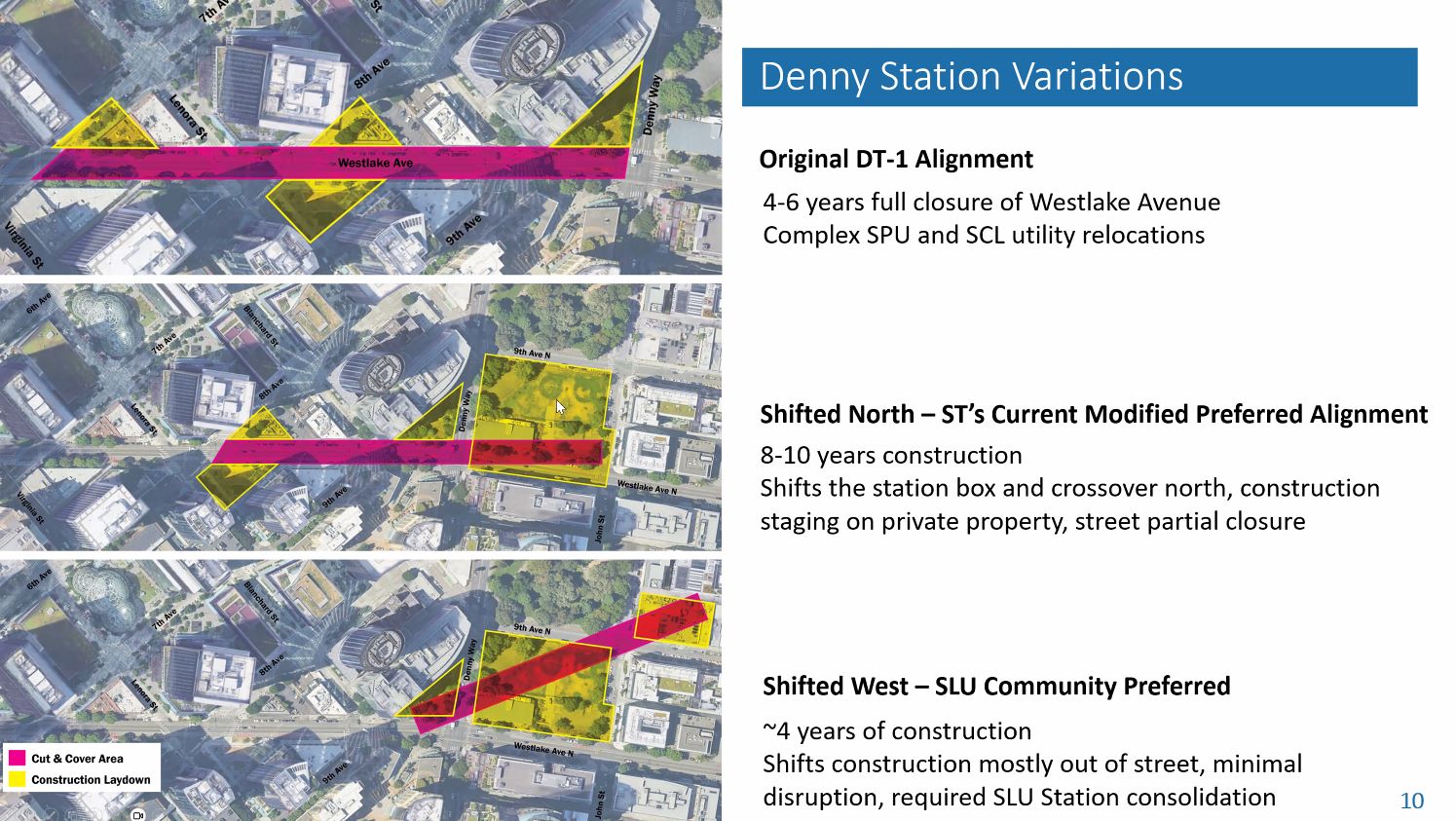 Denny Station variations slide shows the Original DT-1 Alignment would have a 4-6 years full closure of Westlake Avenue and complex SPU and SCL utility relocations. Shifted North has 8-10 years of construction but only a partial street closure. Shifted West has about of years of construction mostly out of street by putting the station box mostly on private property just west of Westlake.