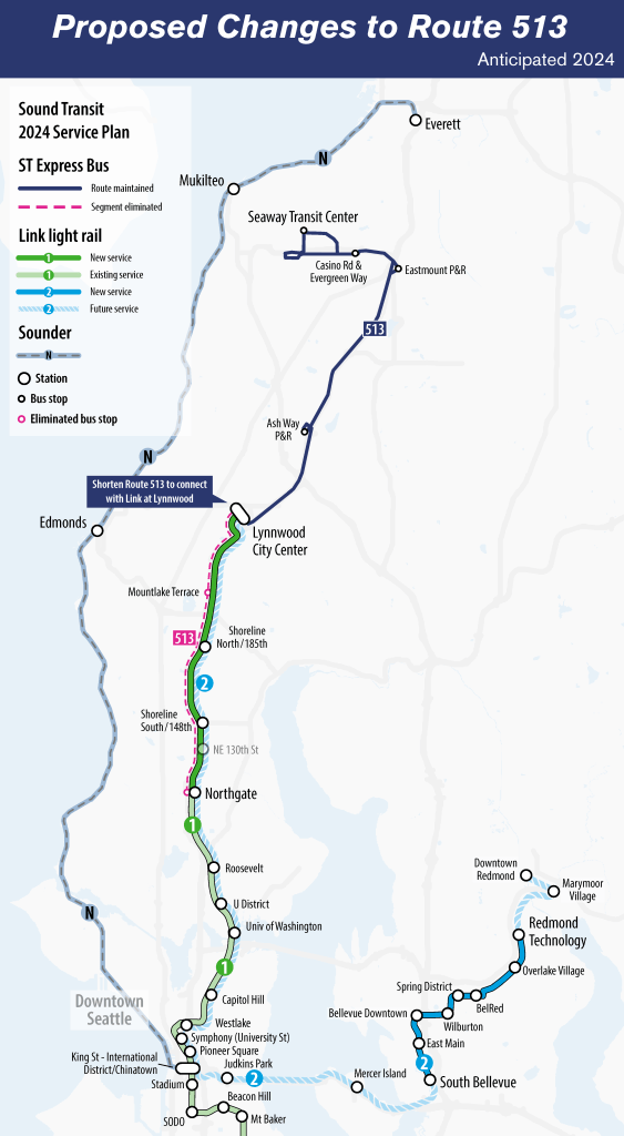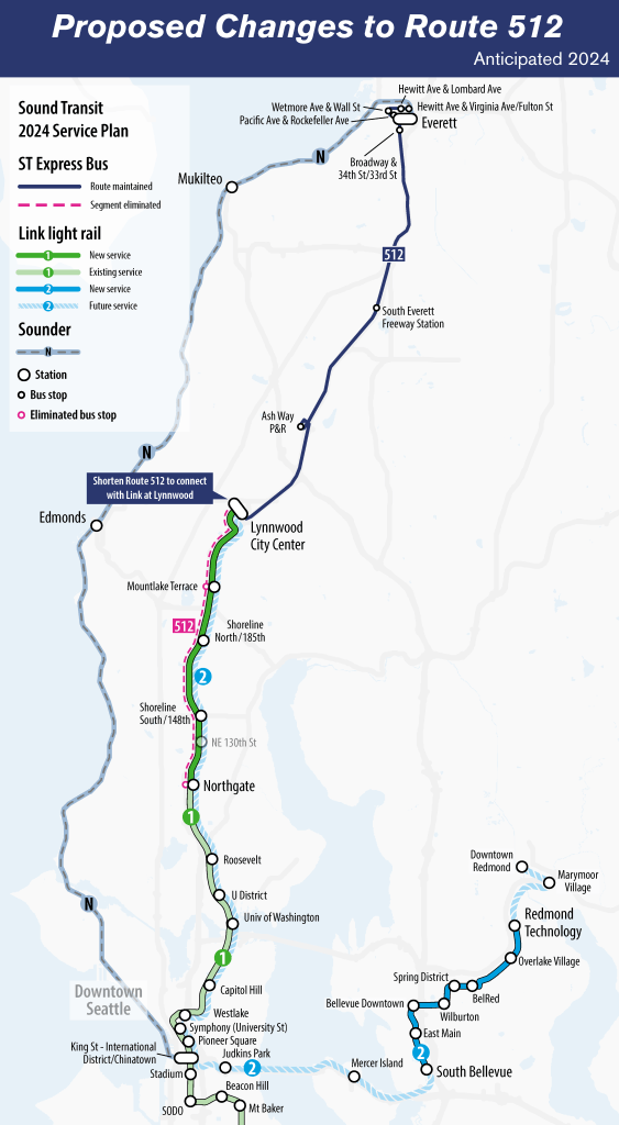 Changes to Sound Transit services aren’t the only things that will affect transit service for Snohomish County riders. Community Transit, which is the county’s main local transit provider, is still moving ahead with plans to end all Snohomish County-Seattle commuter bus service this year. That means that the 400 and 800 series routes will be fully retired, no longer serving Downtown Seattle and Northgate. Service hours saved from this will be redeployed in Snohomish County to help the agency realize its local service growth plans, though some commuter routes will be converted in the new 900 series with most of those routes running to and from Lynnwood City Center during weekday peak-hours — those could be potential alternatives to Routes 510, 512, and 513.
