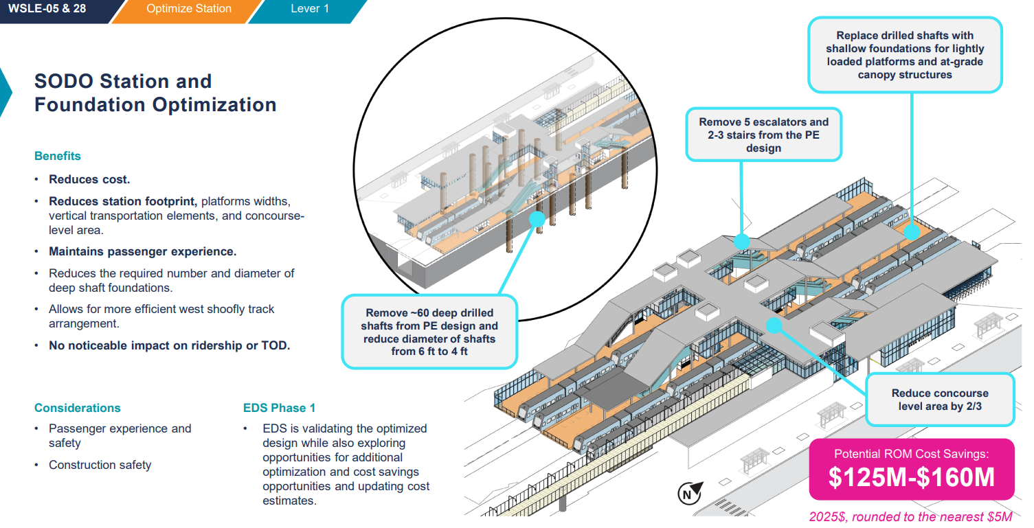 Sound Transit has found some very promising areas for cost savings, even if they likely won't be enough to get the project in the affordable range. Redesigning West Seattle Link's SoDo station, by removing five escalators and two or three sets of stairs and shrinking the concourse level by two-thirds, could save as many as $160 million dollars -- a fact that begs the question as to why it was planned like that in the first place. (The Urbanist has repeatedly highlighted the oversized station issue, most recently in a June deep dive.)