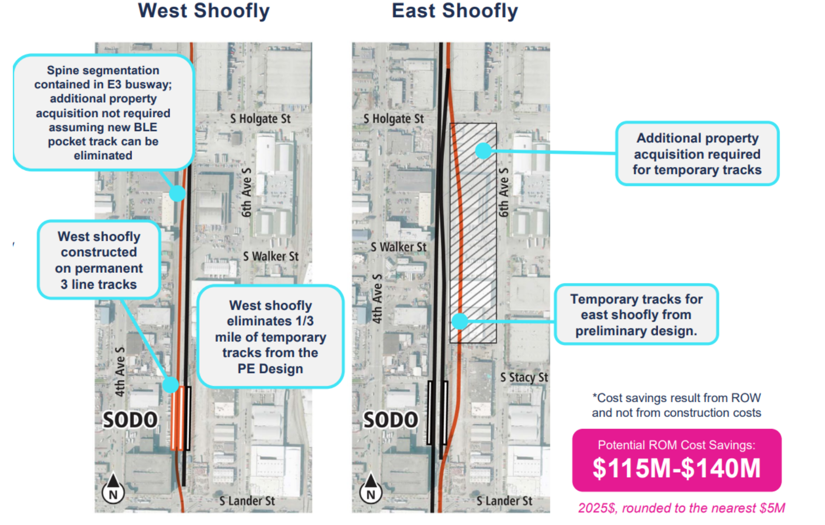 Another $140 million can potentially be saved by shelving plans for a third-mile stretch of temporary (or "shoofly") tracks in SoDo, avoiding the need to demolish several blocks of buildings along the existing light rail guideway. By moving the shoofly to the west, Sound Transit can run 1 Line trains through the construction zone on the future 3 Line, which will ultimately run from West Seattle to Everett.