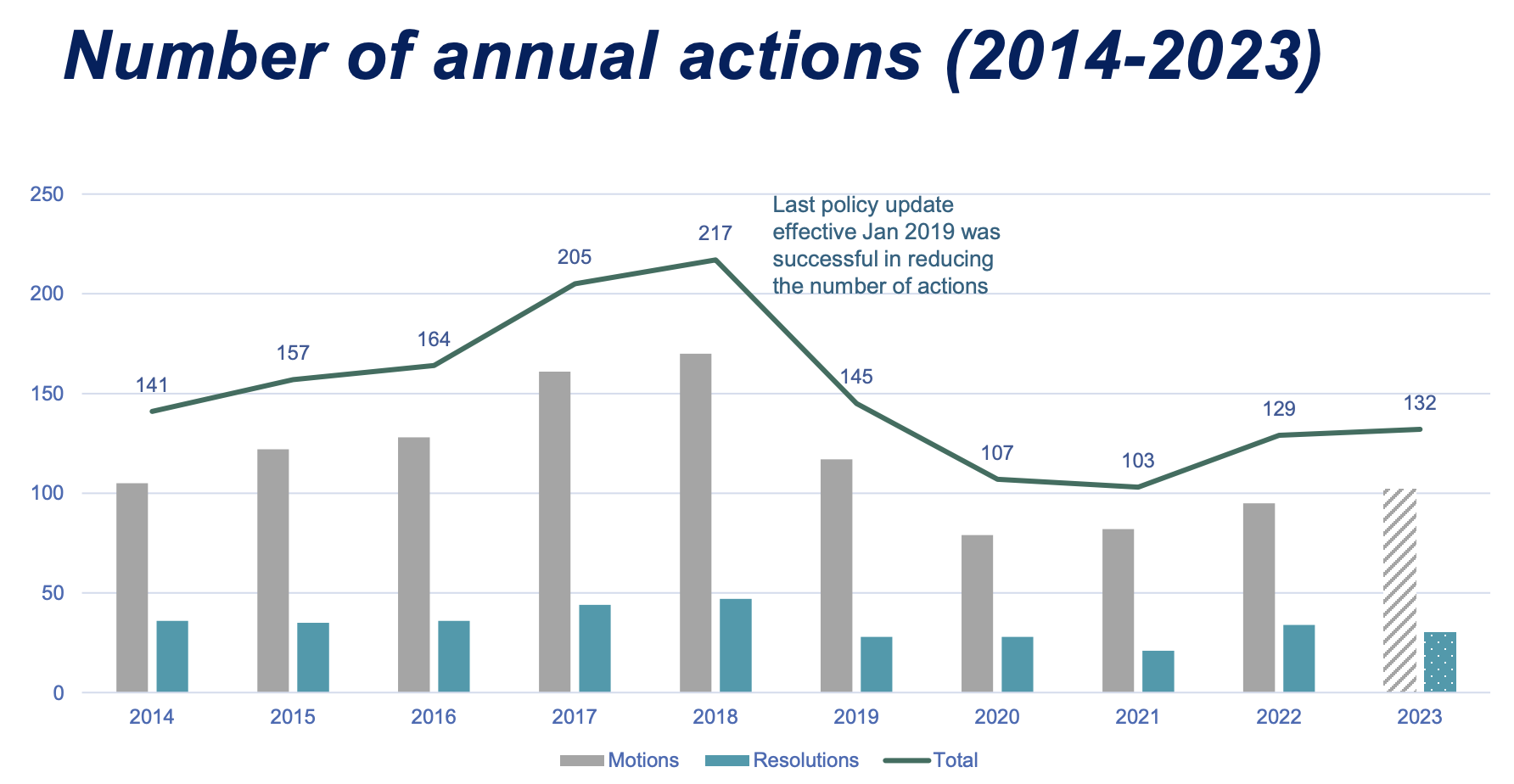 A previous effort to increase delegation of authority to the CEO was quite successful in reducing the number of actions related to contracts, agreements, and other financial decisions. Between 2018 and 2019, the number of actions fell from 217 to 145. Those numbers further fell during the pandemic, but have since bounced back to around 2019 levels.